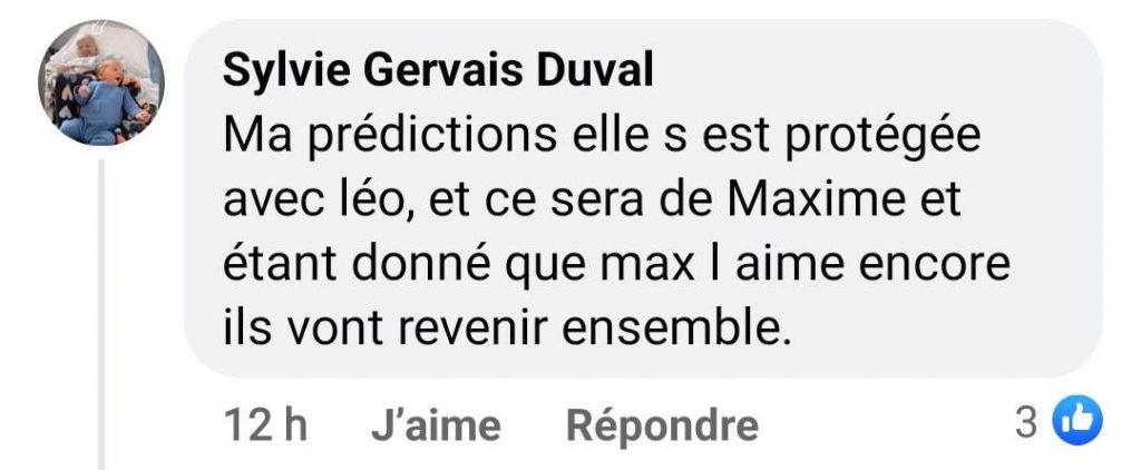 « Ma prédictions elle s est protégée avec léo, et ce sera de Maxime et étant donné que max l aime encore ils vont revenir ensemble. » – Sylvie Gervais Duval