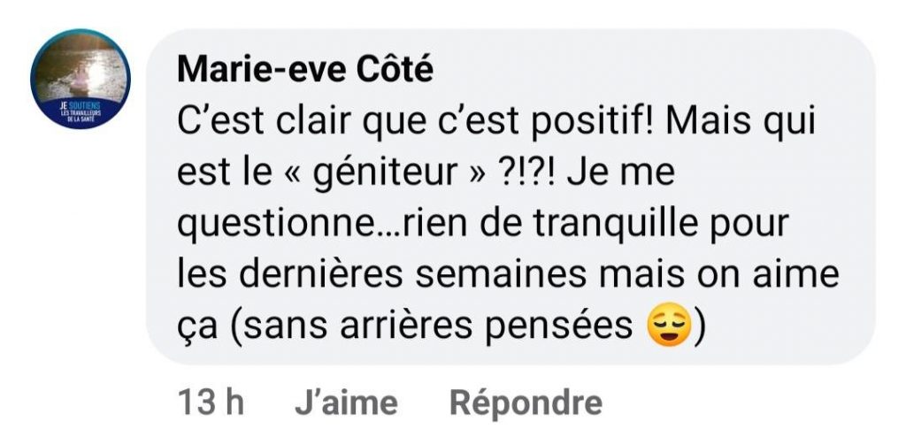 « C’est clair que c’est positif! Mais qui est le « géniteur » ?!?! Je me questionne…rien de tranquille pour les dernières semaines mais on aime ça (sans arrières pensées) » – Marie-eve Côté