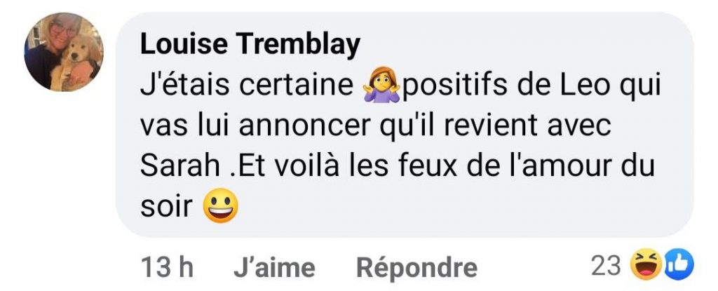 « J’étais certaine! Positifs de Leo qui vas lui annoncer qu’il revient avec Sarah .Et voilà les feux de l’amour du soir. » – Louise Tremblay