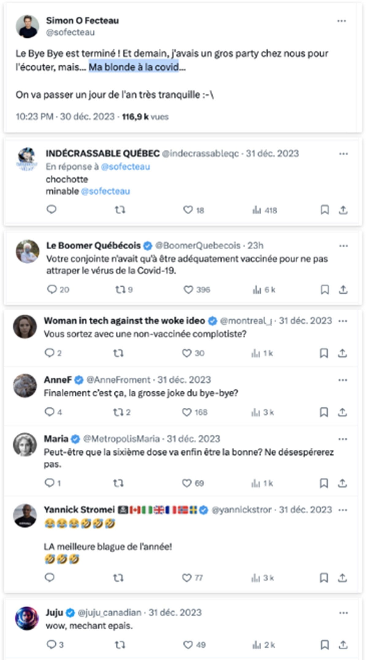 « Le Bye Bye est terminé! Et demain, j’avais un gros party chez nous pour l’écouter, mais… Ma blonde a la covid… On va passer un jour de l’an très tranquille. »