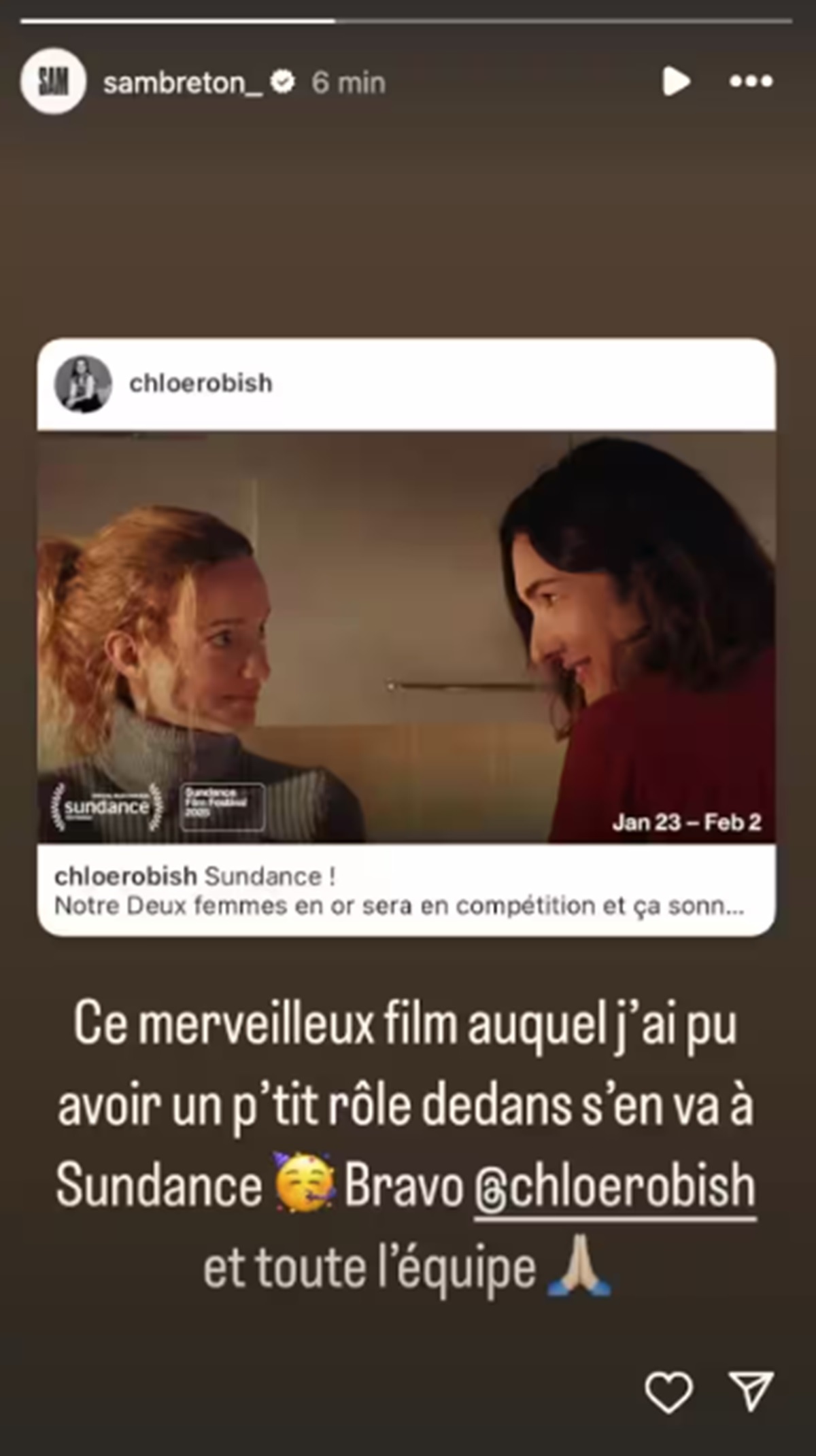 « Ce merveille film auquel j’ai pu avoir un p’tit rôle dedans s’en va à Sundance Bravo Chloé Robichaud et toute l’équipe »
