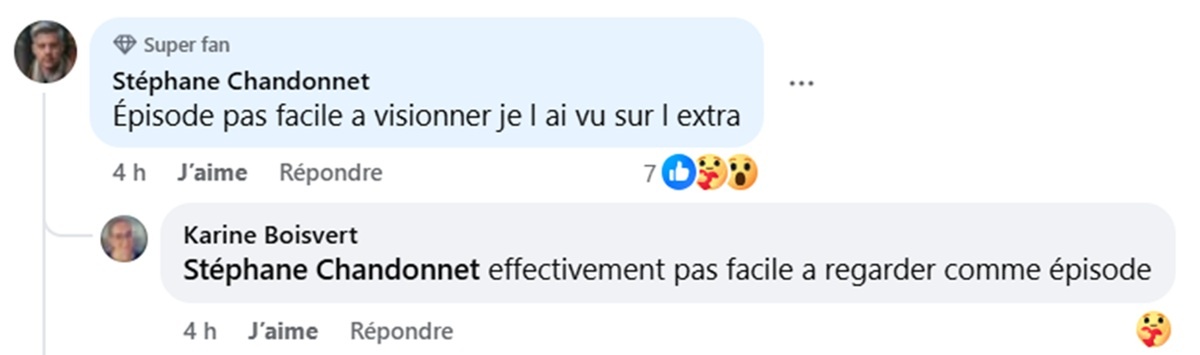 Une internaute approuve le commentaire en répondant : « effectivement pas facile a regarder comme épisode. »