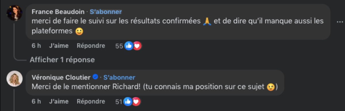 En commentaire, les internautes étaient très intéressés par la question. Parmi les commentaires, il y en avait même de Véronique Cloutier et France Beaudoin!