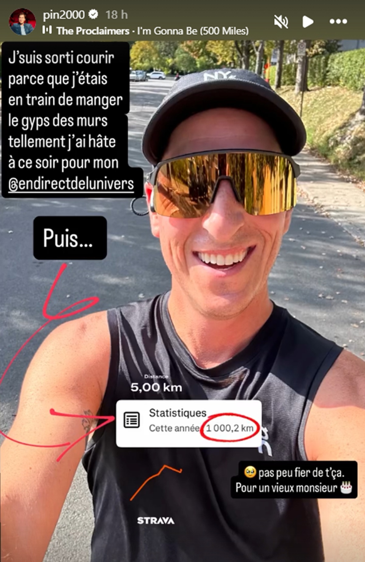 « J’suis sorti courir parce que j’étais en train de manger le gyps des murs tellement j’ai hâte à ce soir pour mon En direct de l’univers »