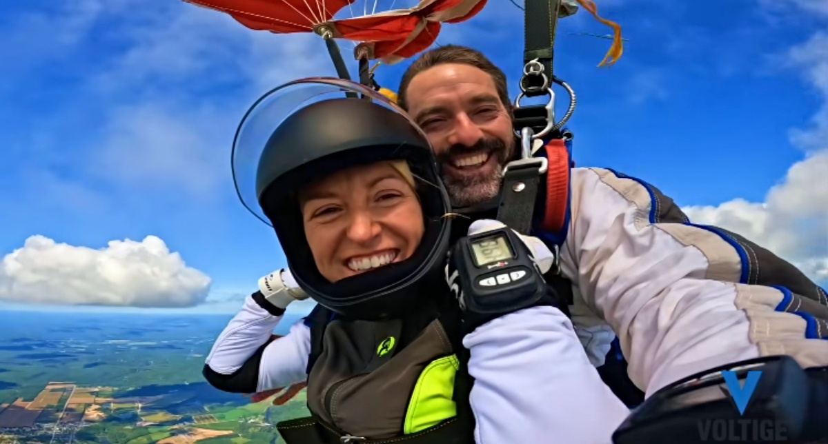 Guillaume est instructeur dans le monde du parachutisme et récemment, il a même fait un chaut en tandem avec sa blonde.