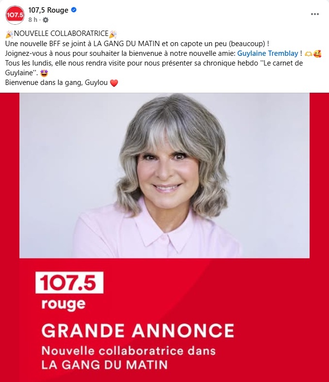 Voici l’annonce que la station de radio 107,5 Rouge a faite afin de mentionner le nouveau défi de Guylaine Tremblay :
