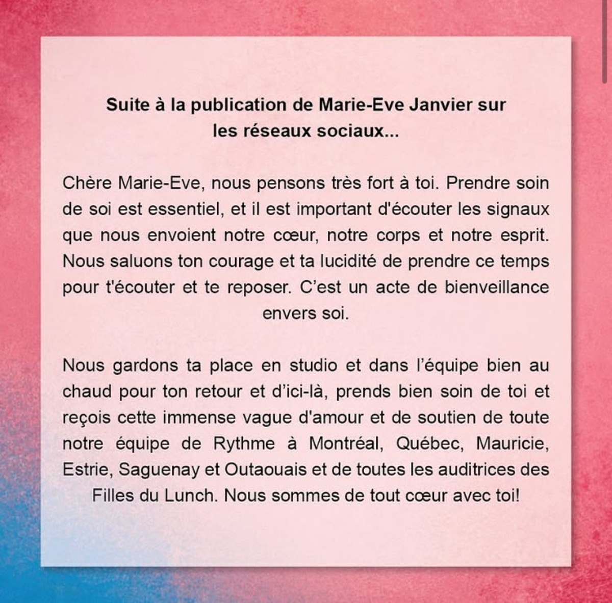 Nous gardons ta place en studio et dans l’équipe bien au chaud pour ton retour et d’ici-là, prends bien soin de toi et reçois cette immense vague d’amour et de soutien de toute notre équipe de Rythme à Montréal, Québec, Mauricie, Estrie, Saguenay et Outaouais et de toutes les auditrices des Filles du lunch. Nous sommes de tout coeur avec toi! »