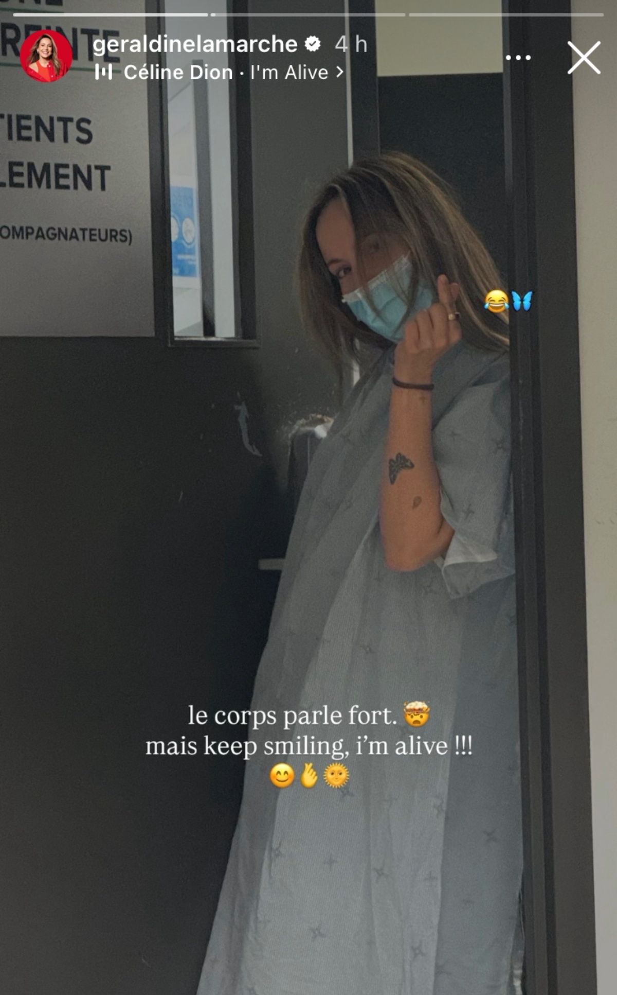 Dans une seconde publication, on peut voir Géraldine Lamarche dans une jaquette d’hôpital.