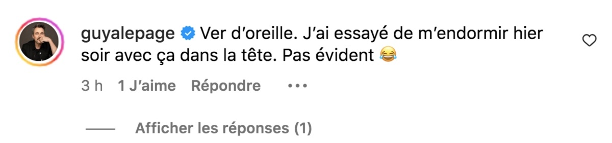 D’ailleurs, l’animateur de Tout le monde en parle a commenté la publication de Laurence Nerbonne. Il mentionne que sa nouvelle chanson est un véritable ver d’oreille. Lorsqu’il a tenté de s’endormir hier soir, il avait ce titre dans la tête…