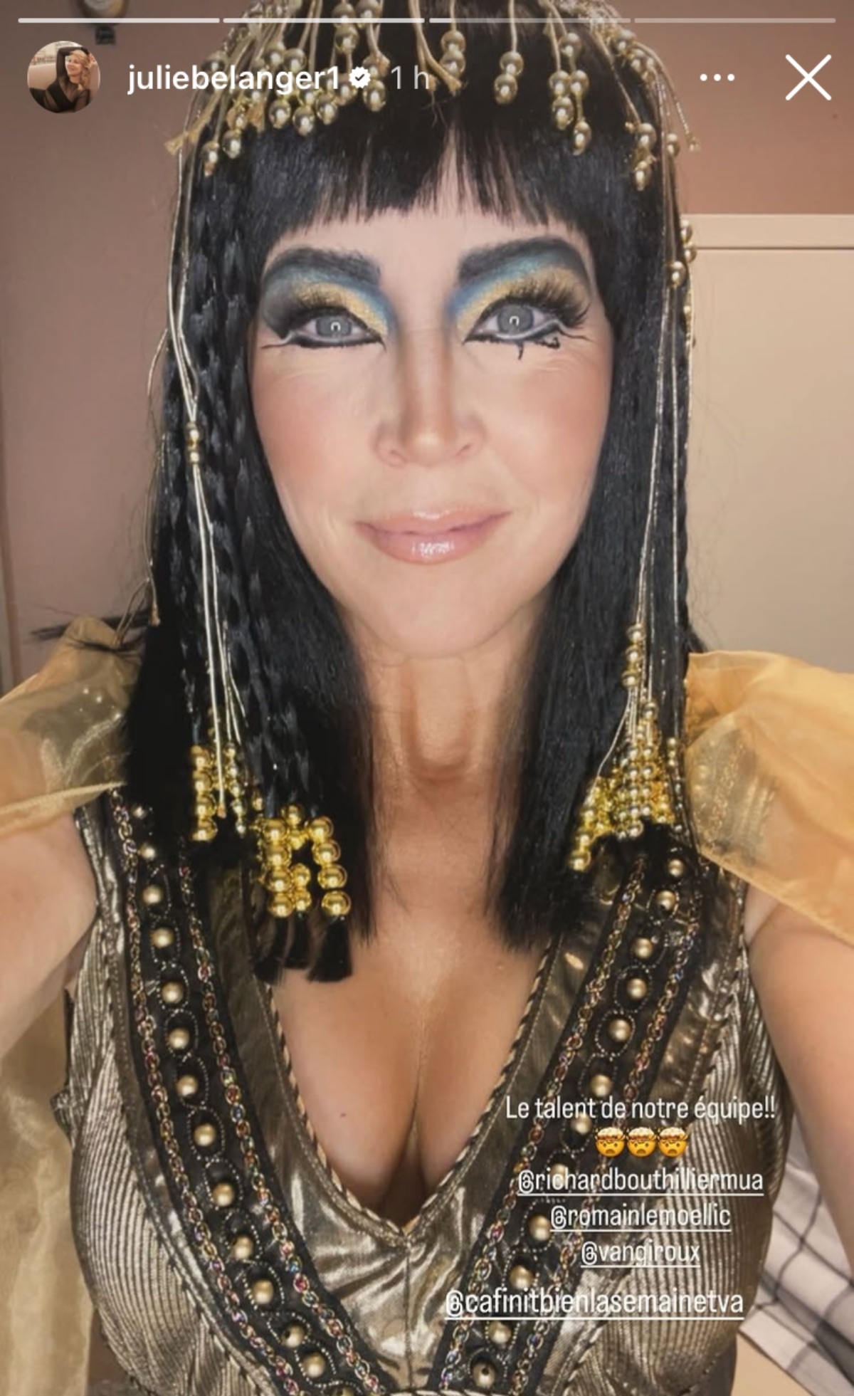 En ce qui concerne Julie Bélanger, elle s’est transformée en la reine Cléopâtre. Elle a donc un costume entièrement doré. Ce qui la change particulièrement est sa perruque noire. Mentionnons que l’animatrice est connue pour sa belle chevelure blonde… Ça fait changement de la voir avec une couleur aussi foncée! Elle a également eu droit à l’expertise de l’équipe de maquillage. Ils lui ont fait des traits de lignes qui rappellent les motifs égyptiens.