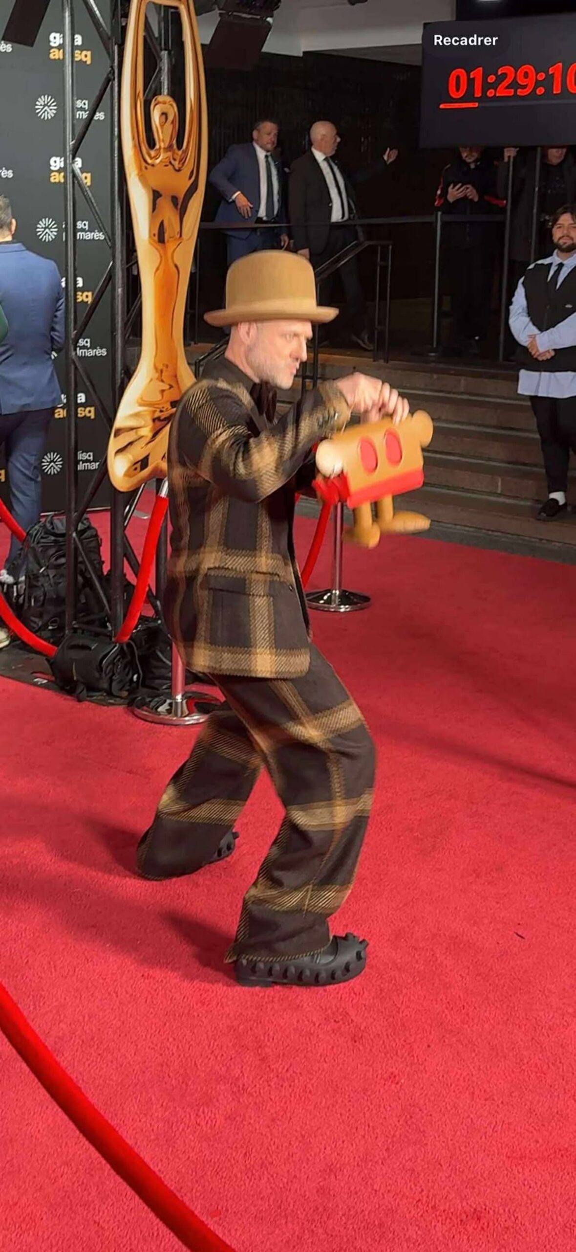 Et que dire de son sac en forme de personnage qu’il tient dans ses mains!