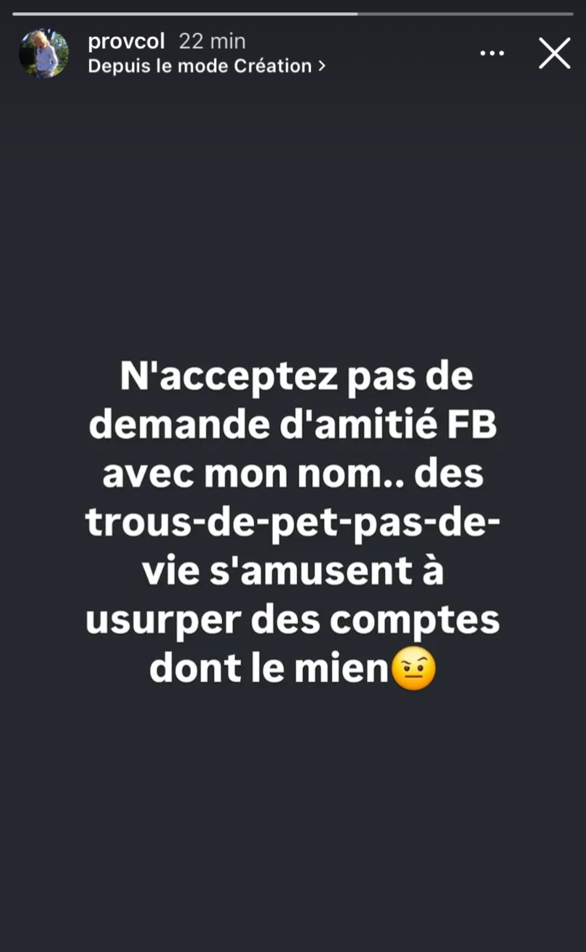 « N’acceptez pas de demande d’amitié FB avec mon nom…. Des trous de pet pas de vie s’amusent à usurper des comptes, dont le mien. »