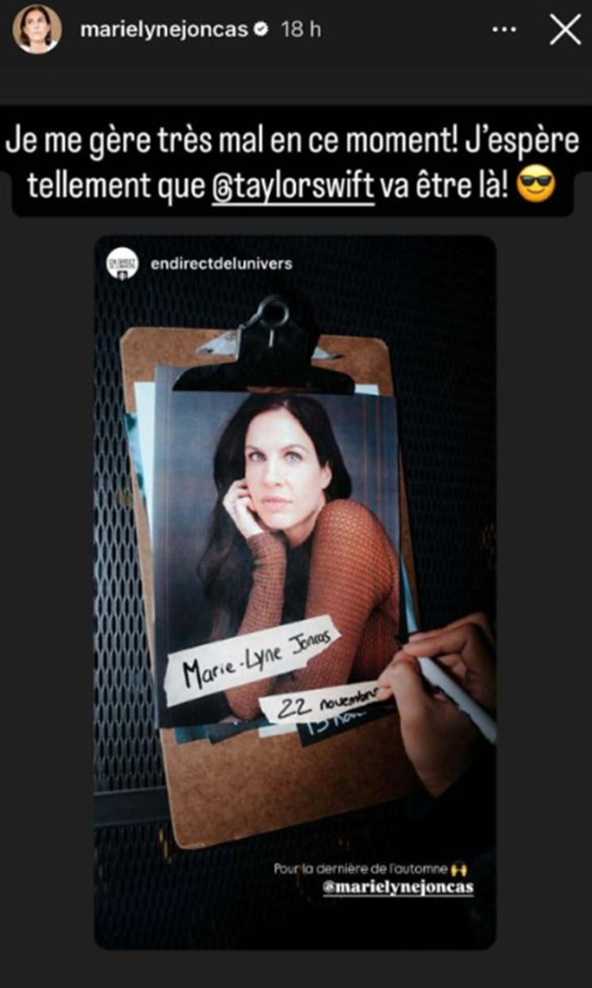 À quelques heures de sa soirée aux côtés de France Beaudoin, Marie-Lyne a lancé à la blague qu’elle souhaite compter sur la présence de la chanteuse internationale Taylor Swift.