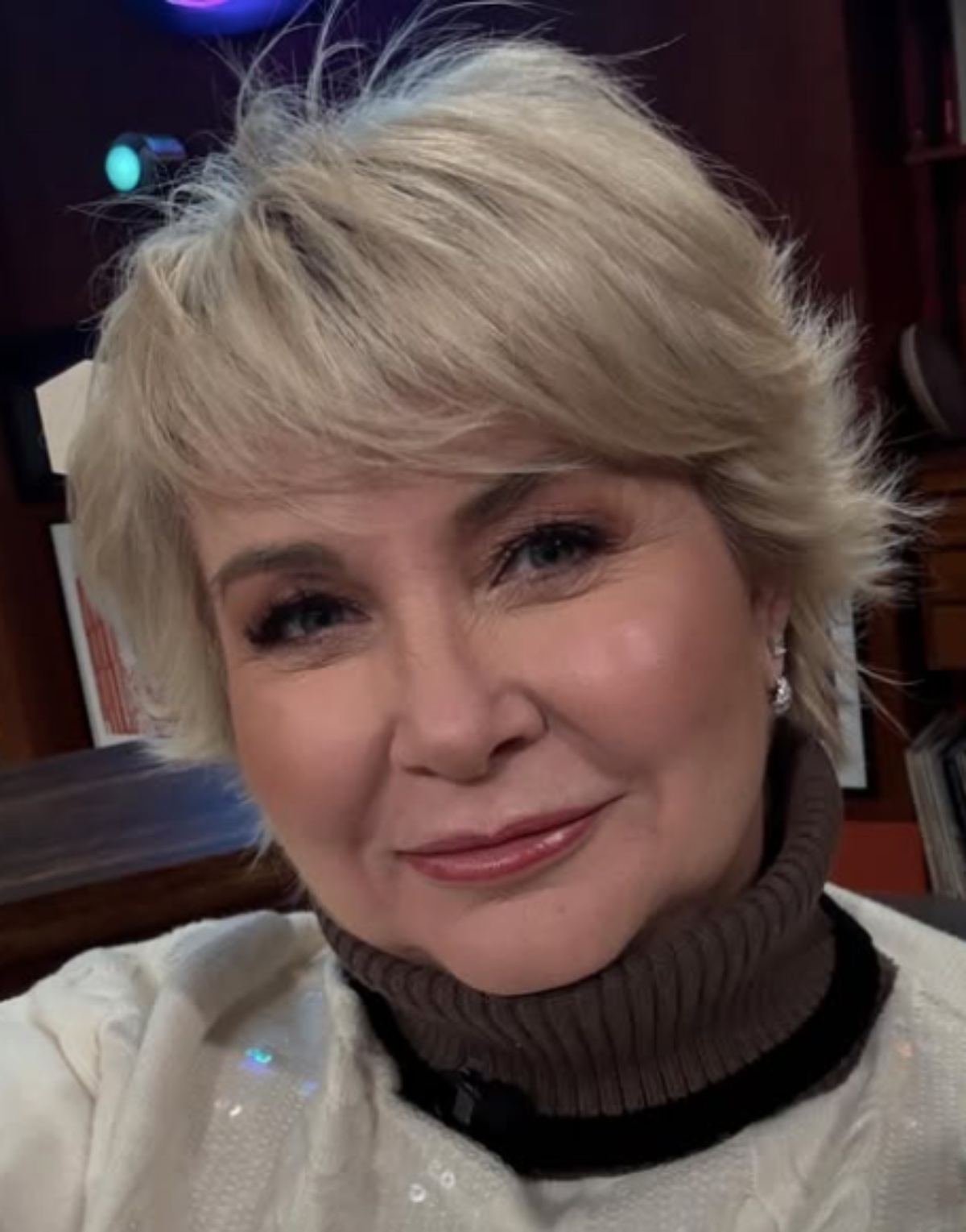 Elle est magnifique, avec son col roulé brun et ses yeux pétillants!