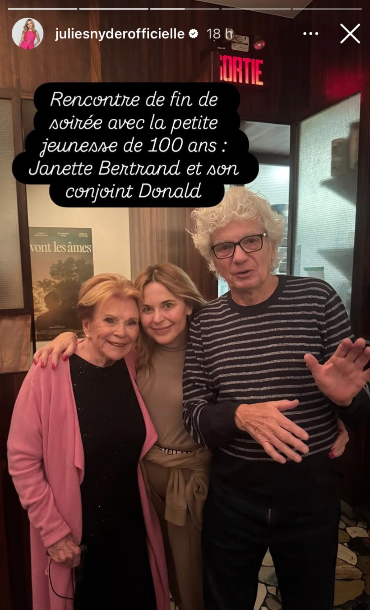Janette Bertrand est une figure marquante de la province de Québec. En effet, son travail de journaliste et de réalisatrice a grandement marqué sa génération puisqu’elle a su démystifier de nombreux tabous. Dernièrement, la centenaire a fait une belle sortie avec son chum Donald Janson… C’est l’animatrice Julie Snyder qui a immortalisé ce moment avec les amoureux!