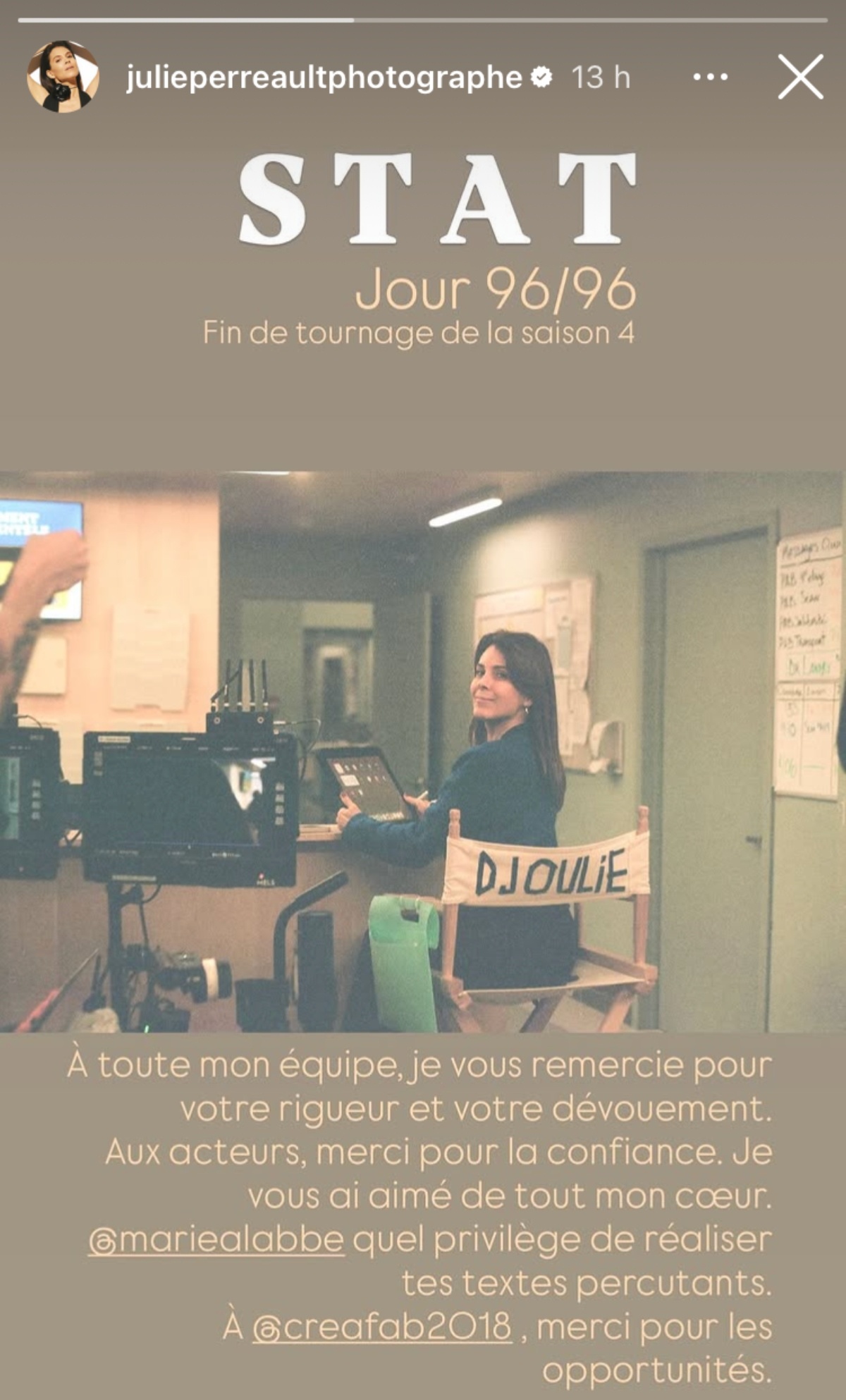 Fin de tournage de la saison 4À toute mon équipe, je vous remercie pour votre rigueur et votre dévouement. Aux acteurs, merci pour la confiance. Je vous ai aimé de tout mon cœur. @mariealabbe quel privilège de réaliser tes textes percutants. À @creafab2018, merci pour les opportunités. »