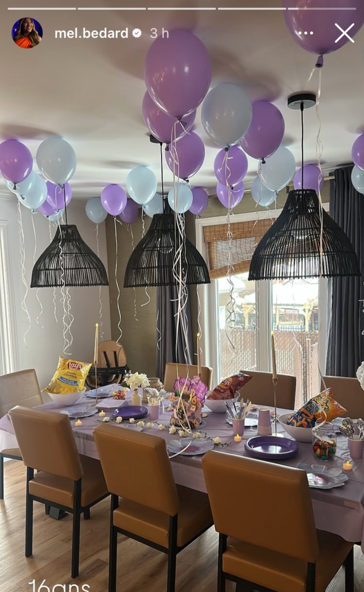 Elle a soufflé plusieurs ballons violets qu’elle a agencés avec une nappe de la même couleur.