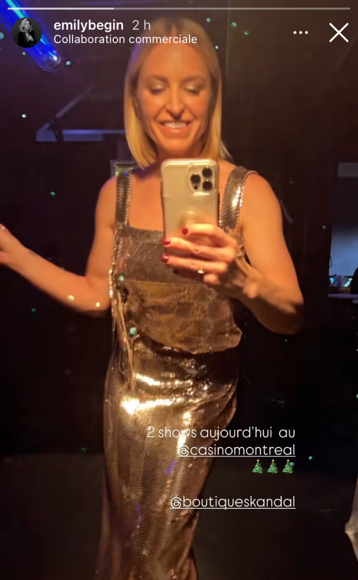 En effet, Émily Bégin a publié son look des Fêtes sur les réseaux sociaux. Il s’agit d’un ensemble entièrement recouvert de paillettes argentées. De ce fait, tous les mouvements de la chanteuse créer un effet scintillant particulièrement festif.