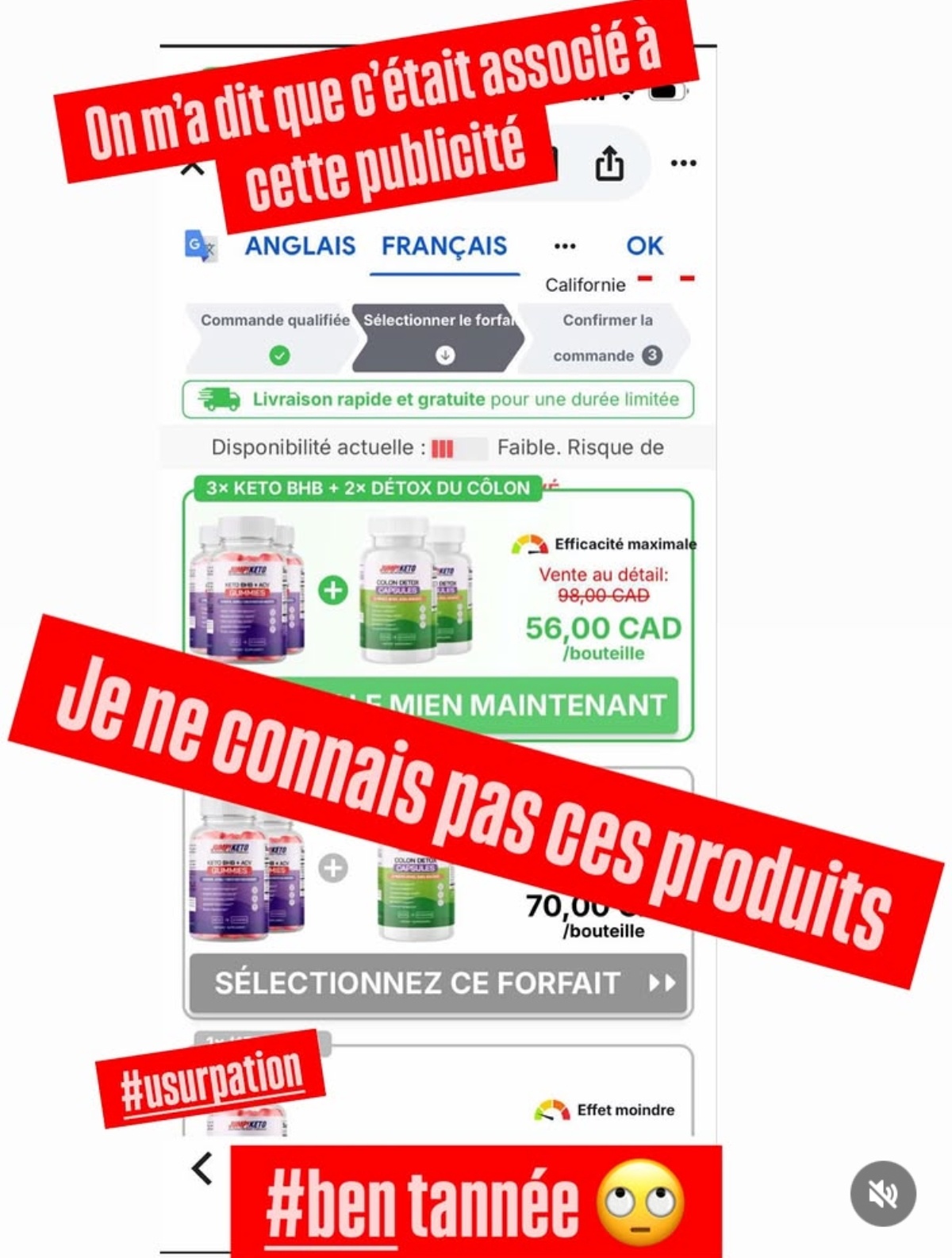 Plus exactement, les arnaqueurs ont utilisé une photo de Mélanie Maynard qui pointe ses muscles abdominaux. Elle a donc partagé une capture d’écran sur laquelle elle mentionne qu’il ne s’agit pas de ses abdos. Elle a également tenu à inscrire plusieurs mots-clés tels que faux, arnaque, fausse publicité et usurpation.