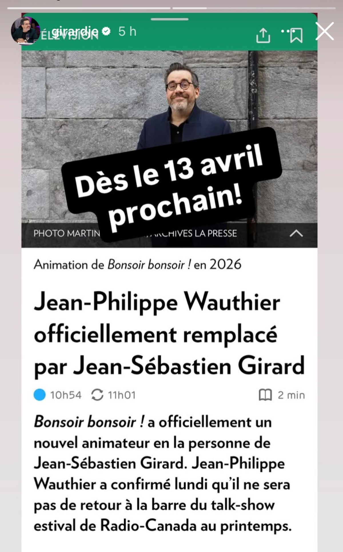 Mentionnons que le public a l’habitude de voir Jean-Sébastien Girard sur le plateau de Bonsoir, Bonsoir.