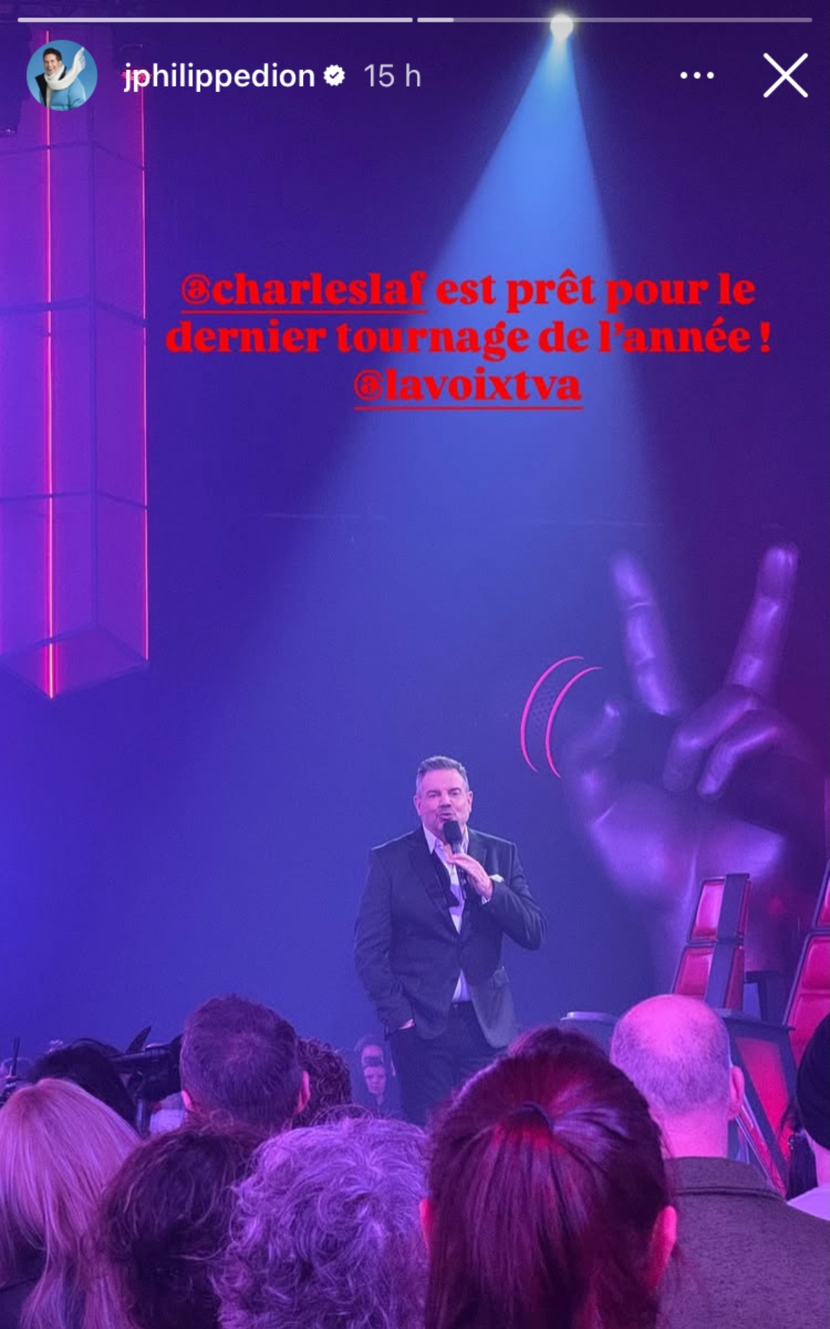 Jean-Philippe Dion a également publié une photographie de l’animateur Charles Lafortune. Ce dernier a repris ce rôle pour la saison 2026 de La Voix. On peut le voir très à l’aise sur scène alors qu’il s’adresse au public.