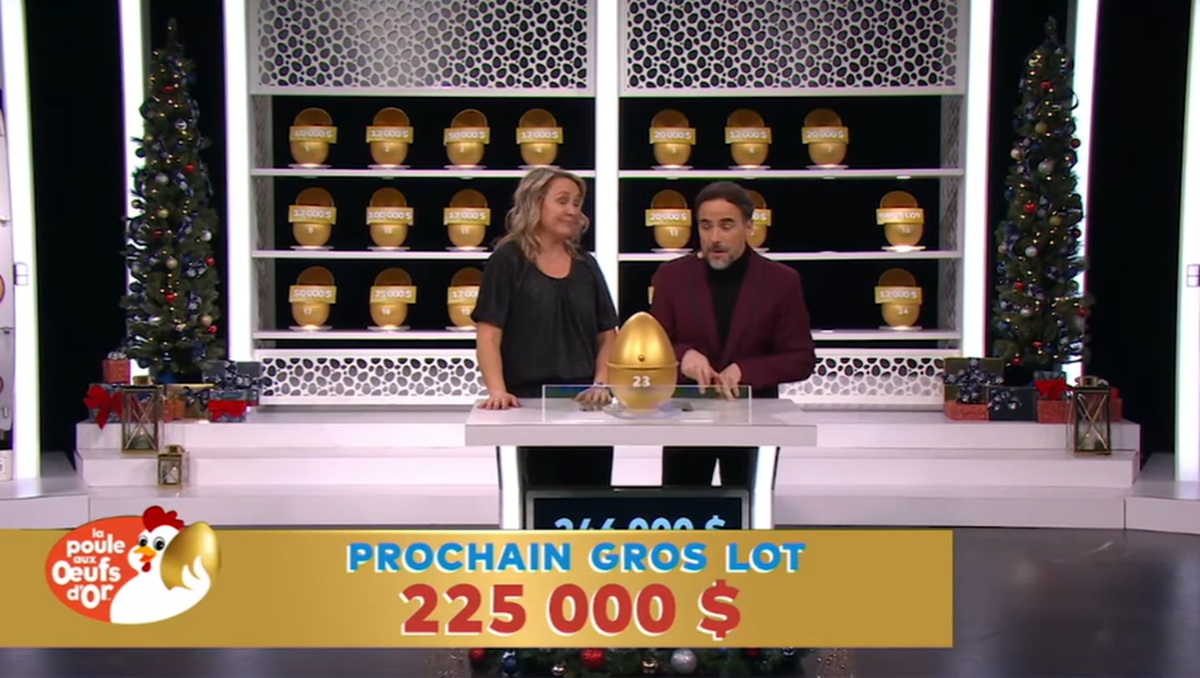 Pour la dernière émission de La poule aux œufs d’or en 2025, le gros lot de La poule aux œufs d’or sera évalué à 225 000 $.
