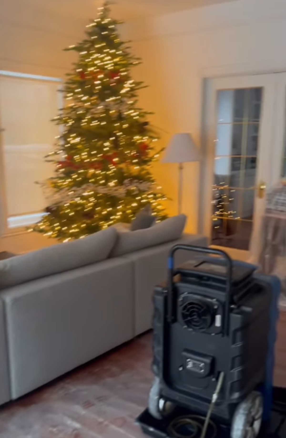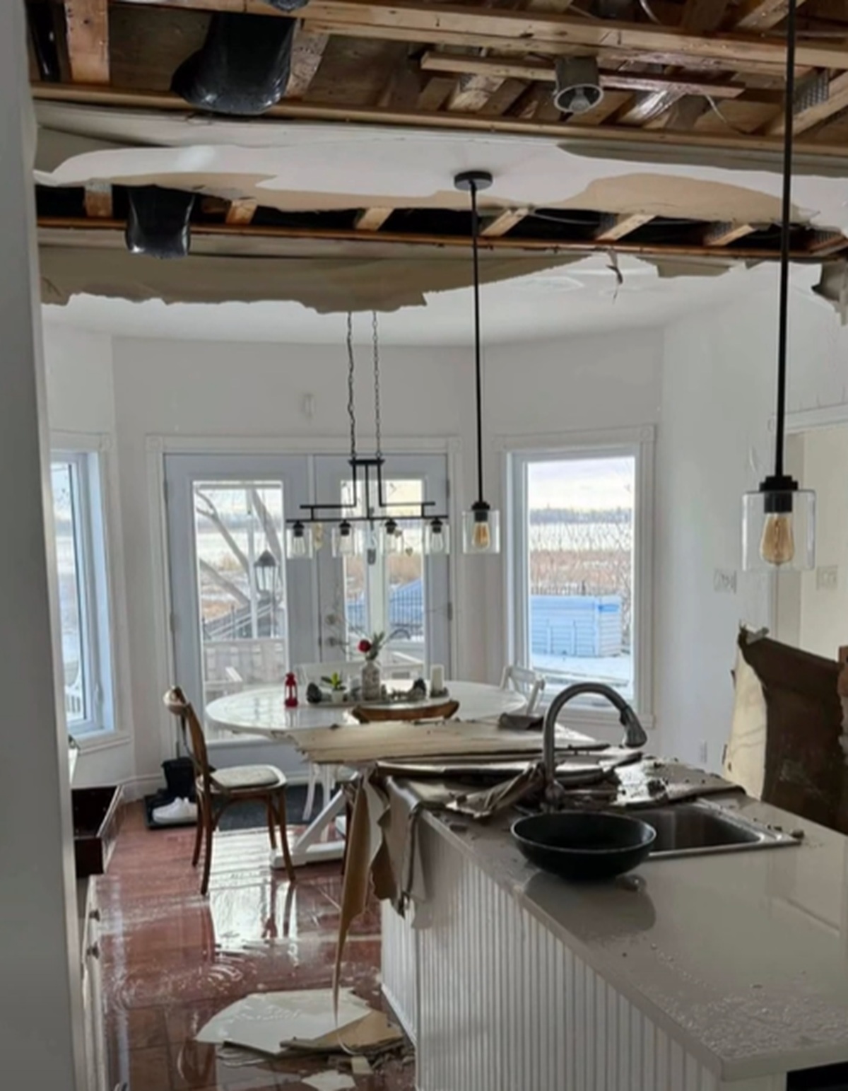 « Ça avait commencé par être des super belles vacances de Noël. Pour la toute première fois, on allait passer un mois dans notre chalet sur la Côte-Nord. C’était vraiment la concrétisation d’un grand rêve. Tout avait bien débuté jusqu’au 20 décembre. Je ne le sais pas encore, mais au même moment, pendant que j’avais du fun avec ma famille, il y avait un dégât d’eau qui se passait majeur dans notre maison à Repentigny. Le bordel. On a vu des images de notre caméra de sécurité et c’est notre voisin Luc, que je salue, qui a pu prendre ses images là de chutes Niagara qui passent par trois étages. Donc on avait pas le choix, on est remonté. Le 21 décembre, on s’est tapé 10 heures de route pour aller constater les dégâts avec les deux bébés chiens qui ne comprenaient rien. On est arrivé à notre maison pour voir l’état et heureusement, il y avait eu des premiers travaux pour sécher, donc des gros déshumidificateurs installés partout, des bouts de plafond qui pendouillaient ont été arrachés et on regardait pour la première fois notre maison. Mon beau plancher frisé maintenant. Et notre sapin de Noël, je le voulais comme une joke lui dans le coin. On dirait que c’était ironique. Et voilà, on est le 24 décembre pis va falloir déménager, on vient de l’apprendre. Joyeux Noël! »
