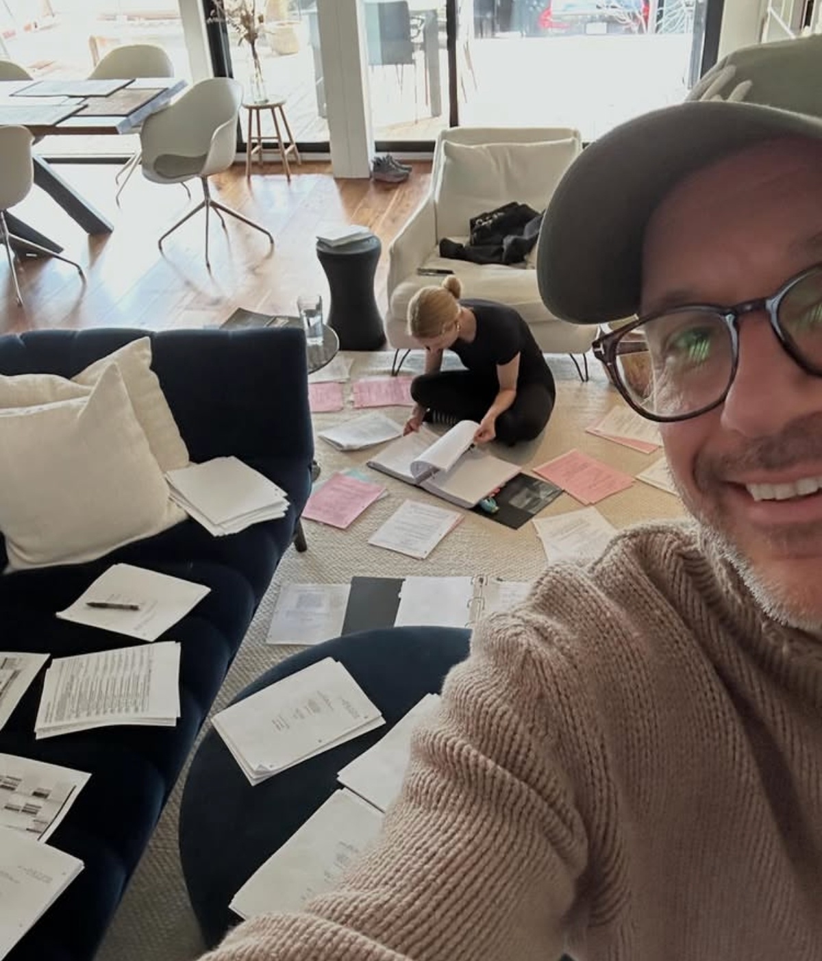 En effet, plusieurs documents ont été déposé sur le plancher et l’actrice est en pleine lecture de l’un d’entre eux!