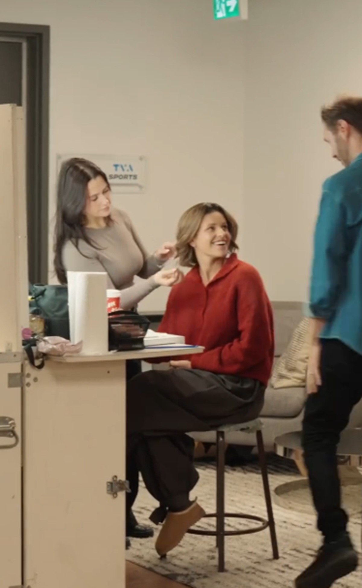 La sosie de l’animatrice et comédienne québécoise est dans les coulisses et elle se fait coiffer.