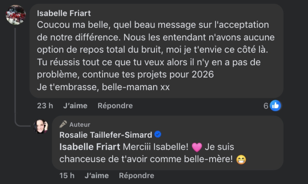 Rosalie Taillefer-Simard est la fille du chanteur René Simard et de l’animatrice Marie-Josée Taillefer. Tout comme ses parents, elle œuvre dans le domaine des arts puisqu’elle est comédienne et animatrice, en plus d’être conférencière, danseuse et artiste visuelle. D’ailleurs, la femme de 34 ans est née avec une surdité sévère. Pour l’année 2026, elle a décidé de faire une précision importante à ce sujet.