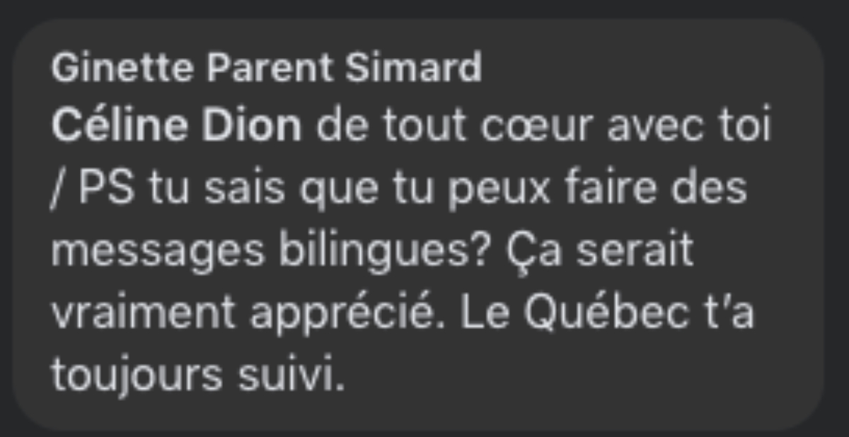 « de tout cœur avec toi / PS tu sais que tu peux faire des messages bilingues? Ça serait vraiment apprécié. Le Québec t’a toujours suivi. »