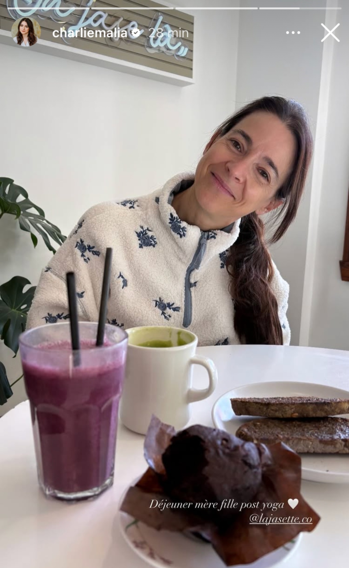Sur la photographie en question, on peut voir la maman partager un bon petit déjeuner avec sa fille au comptoir La Jasette. Il s’agit d’un café à Saint-Sauveur qui se spécialise dans un menu végétarien et sans gluten. À l’origine, le duo mère et fille se sont réunies pour leur séance de yoga et elles ont profité de cette occasion pour faire une sortie entre mère et fille.