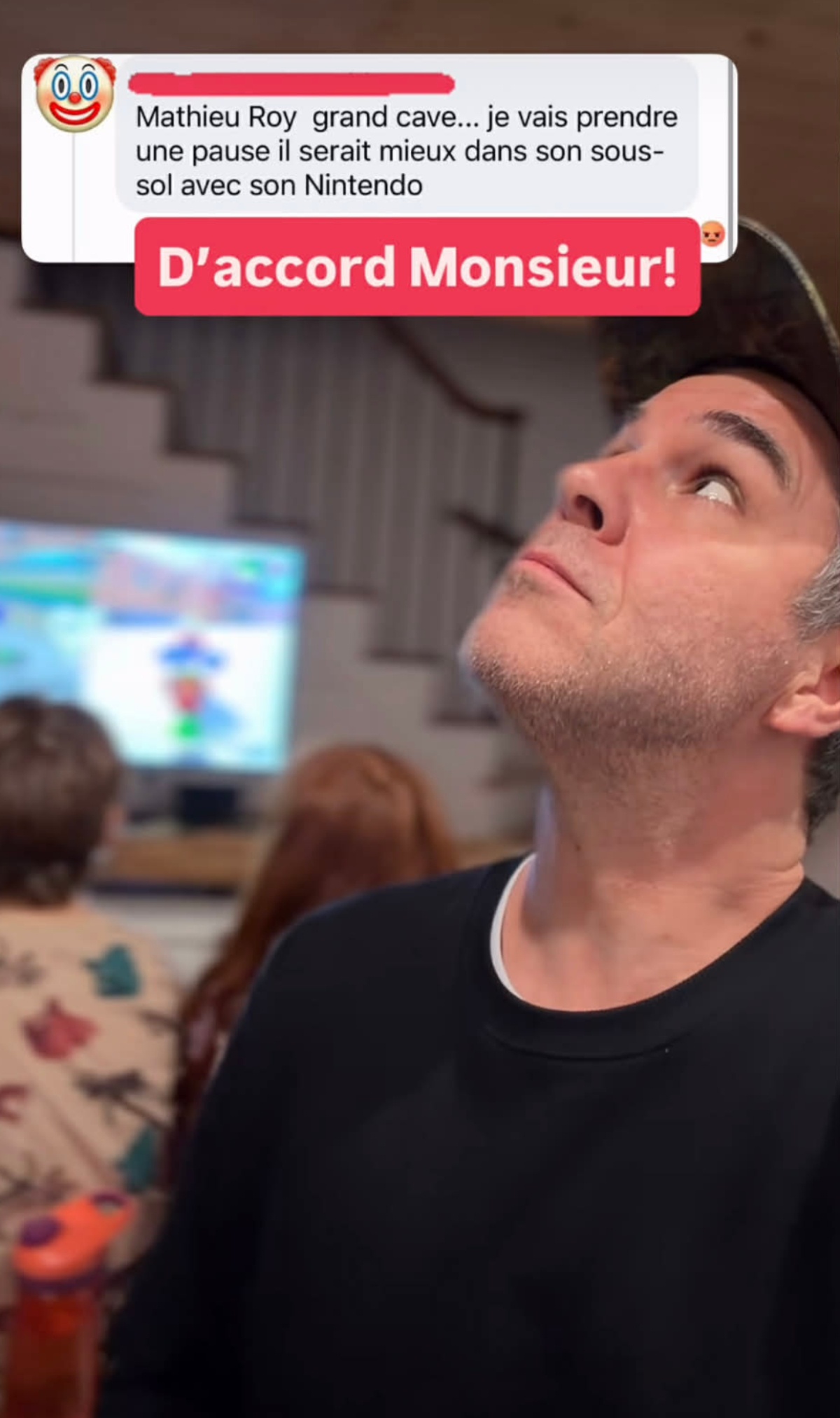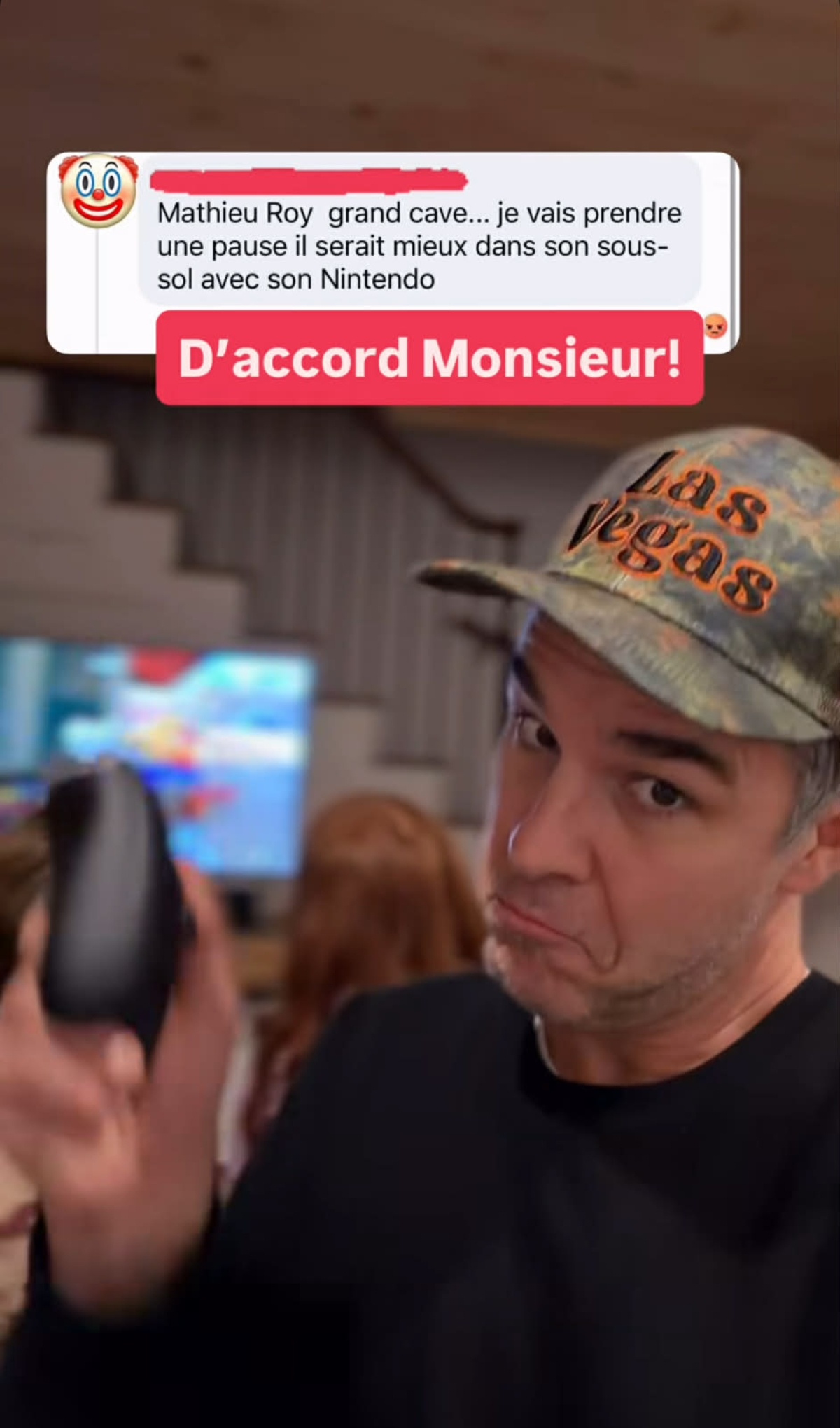 « Mathieu Roy grand cave… je vais prendre une pause il serait mieux dans son sous-sol avec son Nintendo »