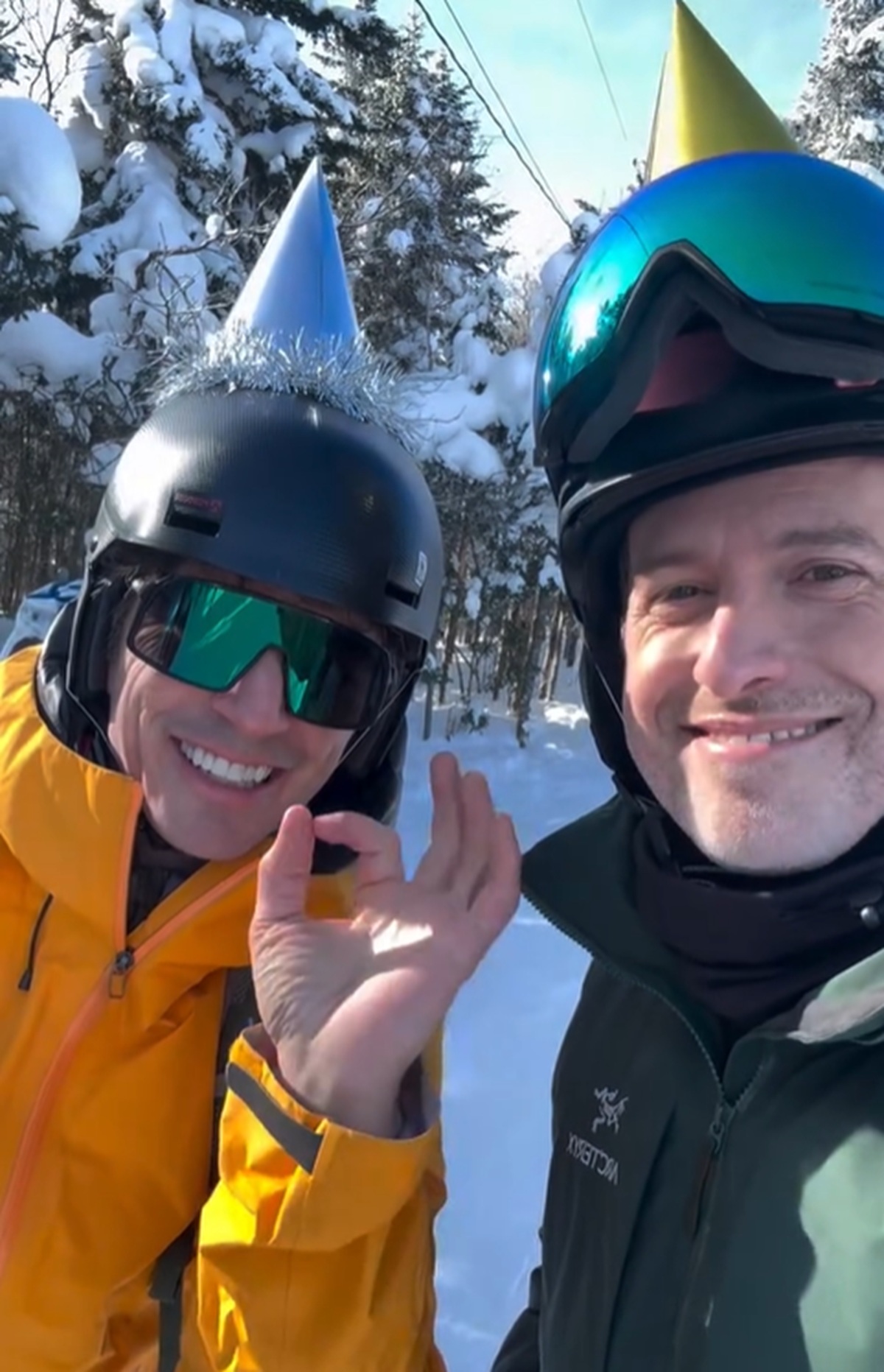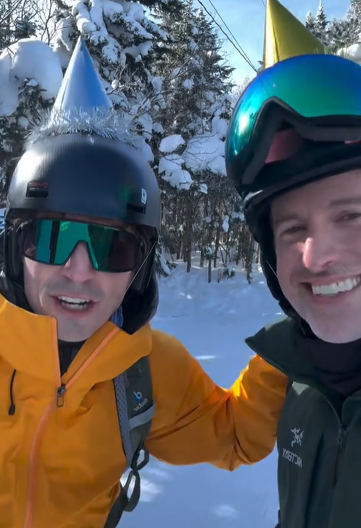 Avec des casques de ski et des chapeaux d’anniversaire par dessus, on peut voir Sébastien Delorme et Jean-Philippe Dion.