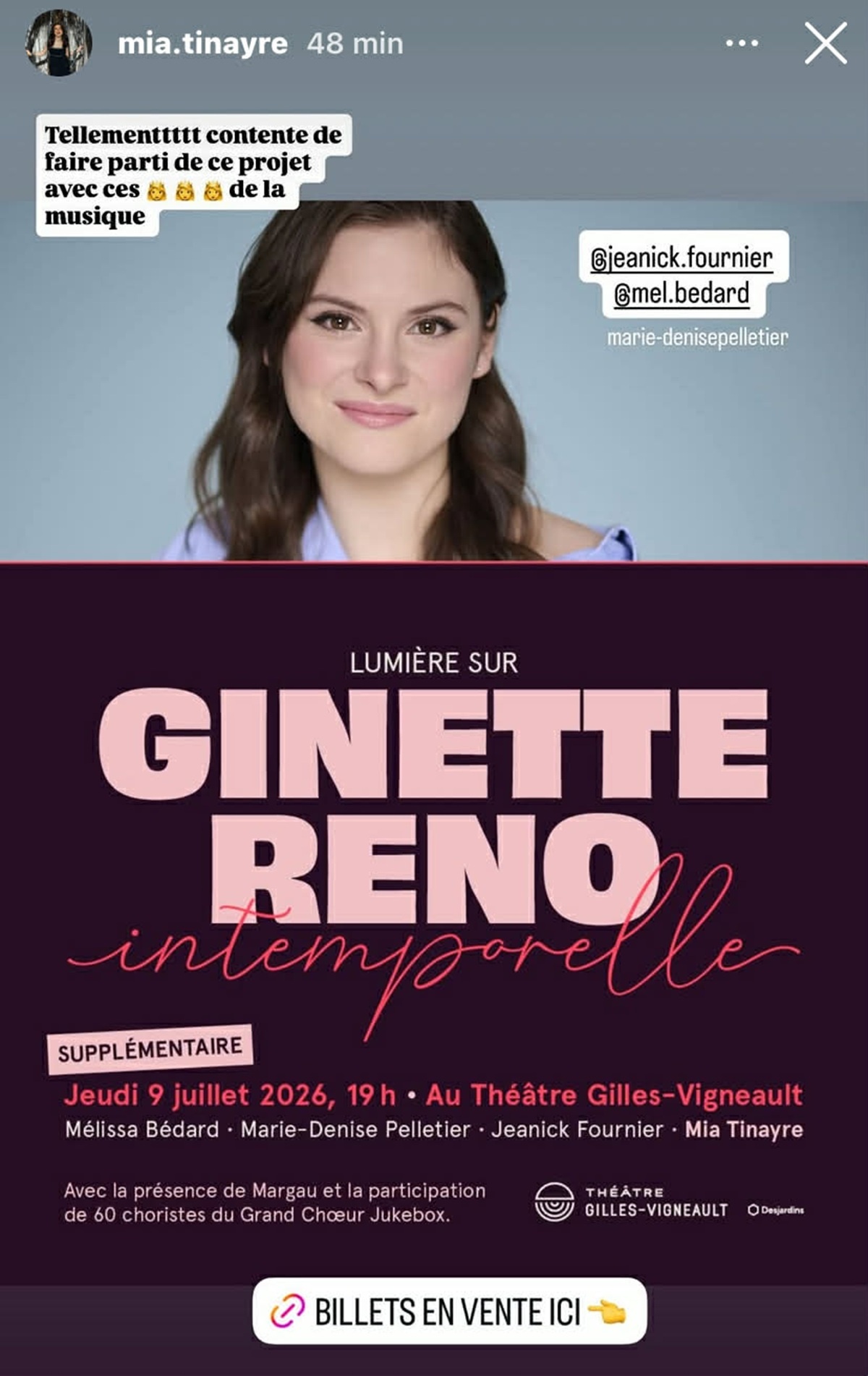 Rappelons que Mia Tinayre est également dans le spectacle Sinatra symphonique avec Marc Hervieux. Cette dernière remplace Marie-Eve Janvier, elle qui est encore en pause professionnelle.