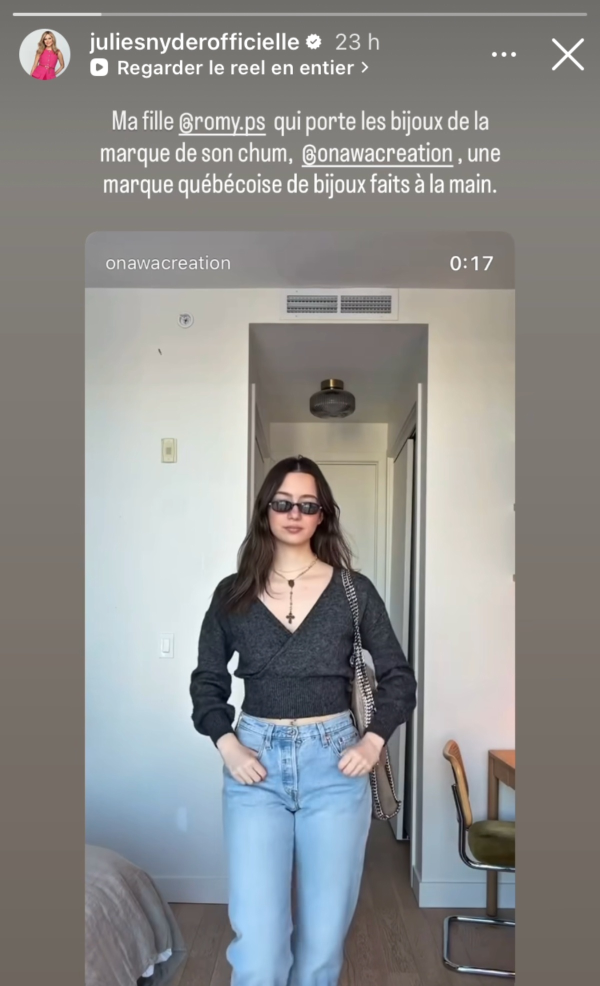 « Ma fille @romy.ps qui porte les bijoux de la marque de son chum. @onawacreation, une marque québécoise de bijoux faits à la main. »