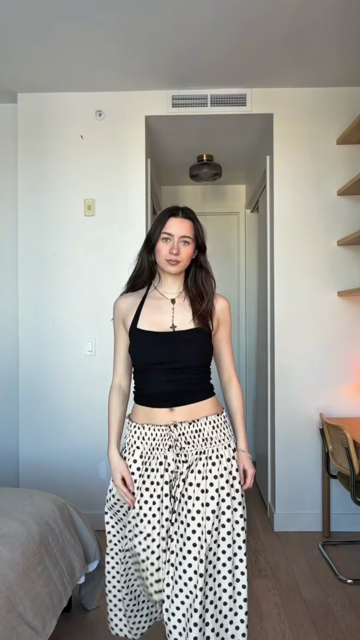 Elle a porté le même bijou avec un top noir et une jupe longue à pois.