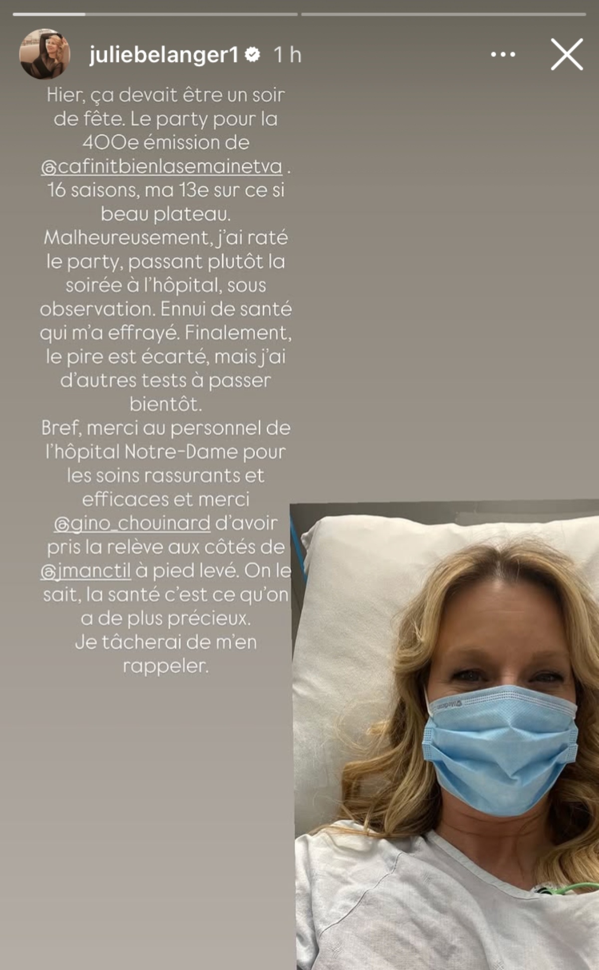 « Hier, ça devait être un soir de fête. Le party pour la 400e émission de @cafinitbienlasemainetvs. 16 saisons, ma 13e sur ce si beau plateau. Malheureusement, j’ai raté le party, passant plutôt la soirée à l’hôpital, sous observation. Ennui de santé qui m’a effrayé. Finalement, le pire est écarté, mais j’ai d’autres tests à passer bientôt. Bref, merci au personnel de l’hôpital Notre-Dame pour les soins rassurants et efficaces et merci @gino_chouinard d’avoir pris la relève aux côtés de @jmantil à pied levé. On le sait, la santé c’est ce qu’on a de plus précieux. Je tâcherai de m’en rappeler. »