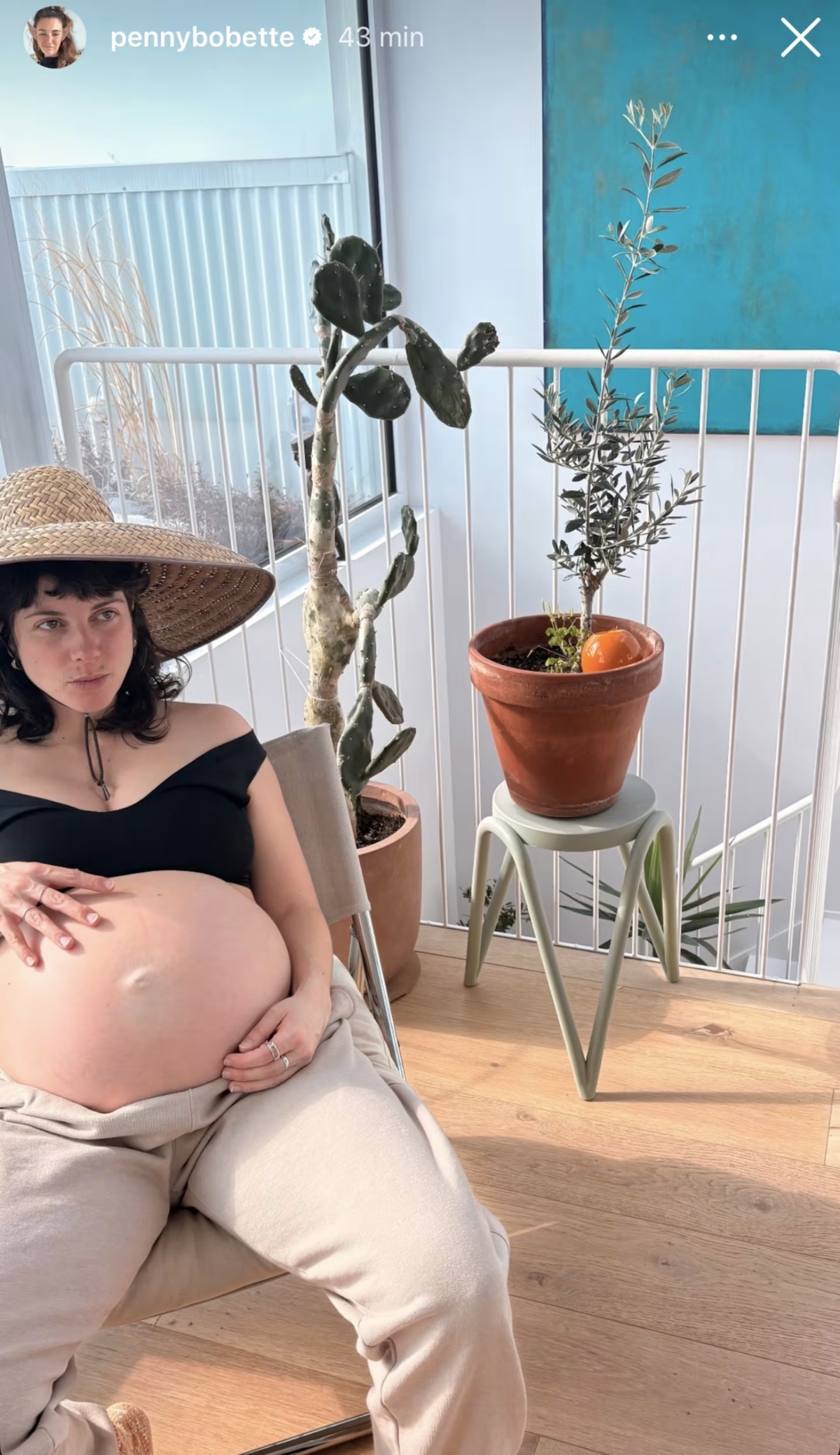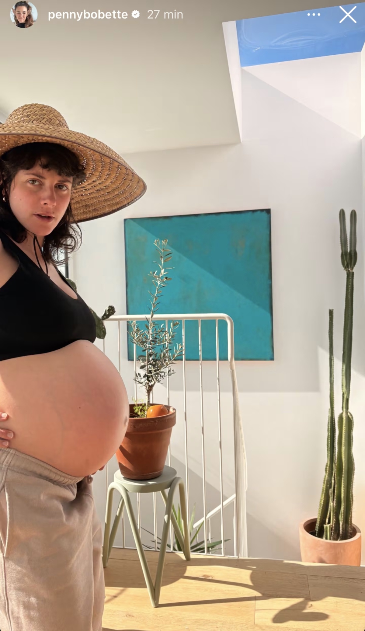 Sur la première photo, on peut voir Valérie Tellos assise alors qu’elle a les mains sur son ventre. Elle porte des vêtements confortables ainsi qu’un joli chapeau de paille.