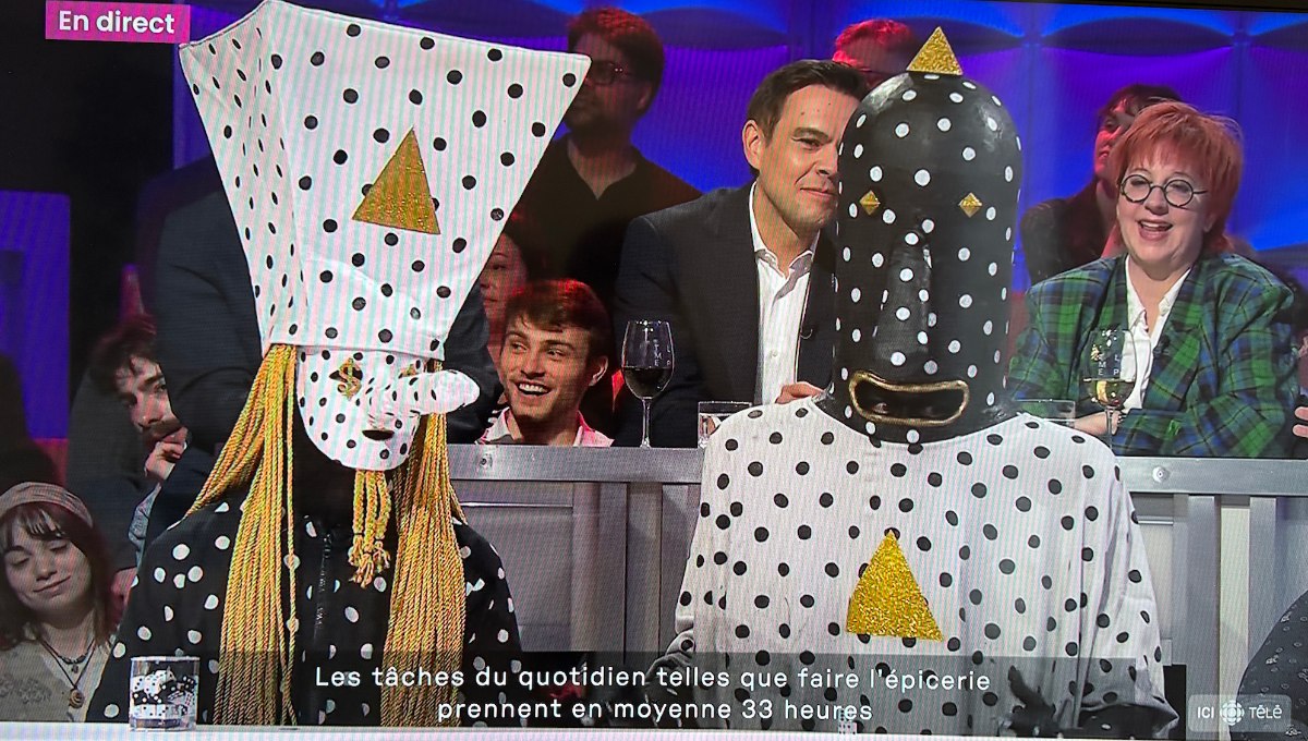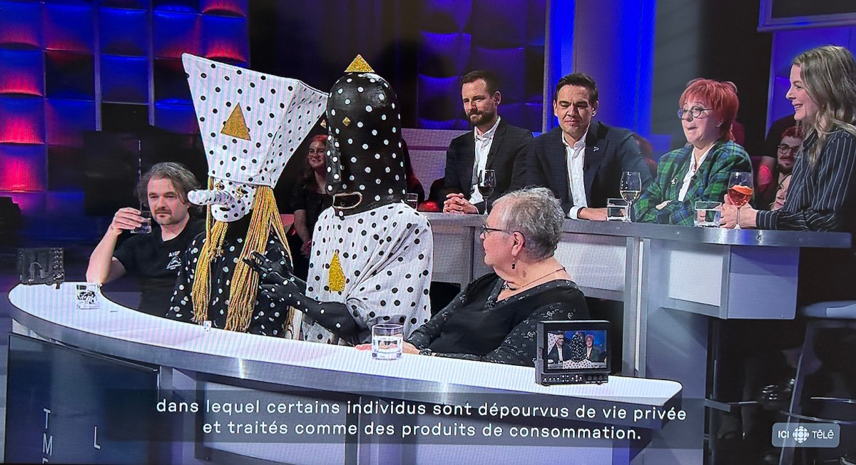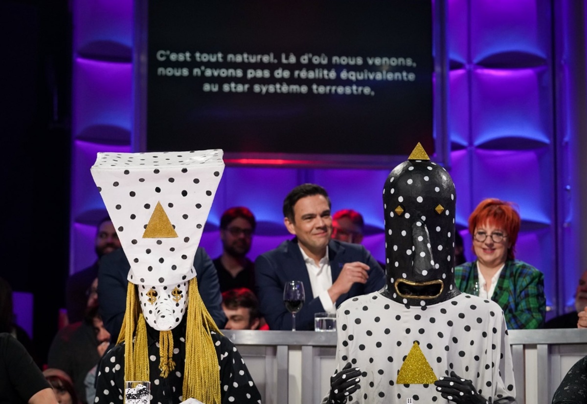 Les membres du duo étaient en compagnie de leur gérant Sébastien Colin. Ce dernier discutait avec l’animateur Guy A. Lepage tandis que Khn de Poitrine et Klek de Poitrine ont répondu dans leur langue avec des sons.