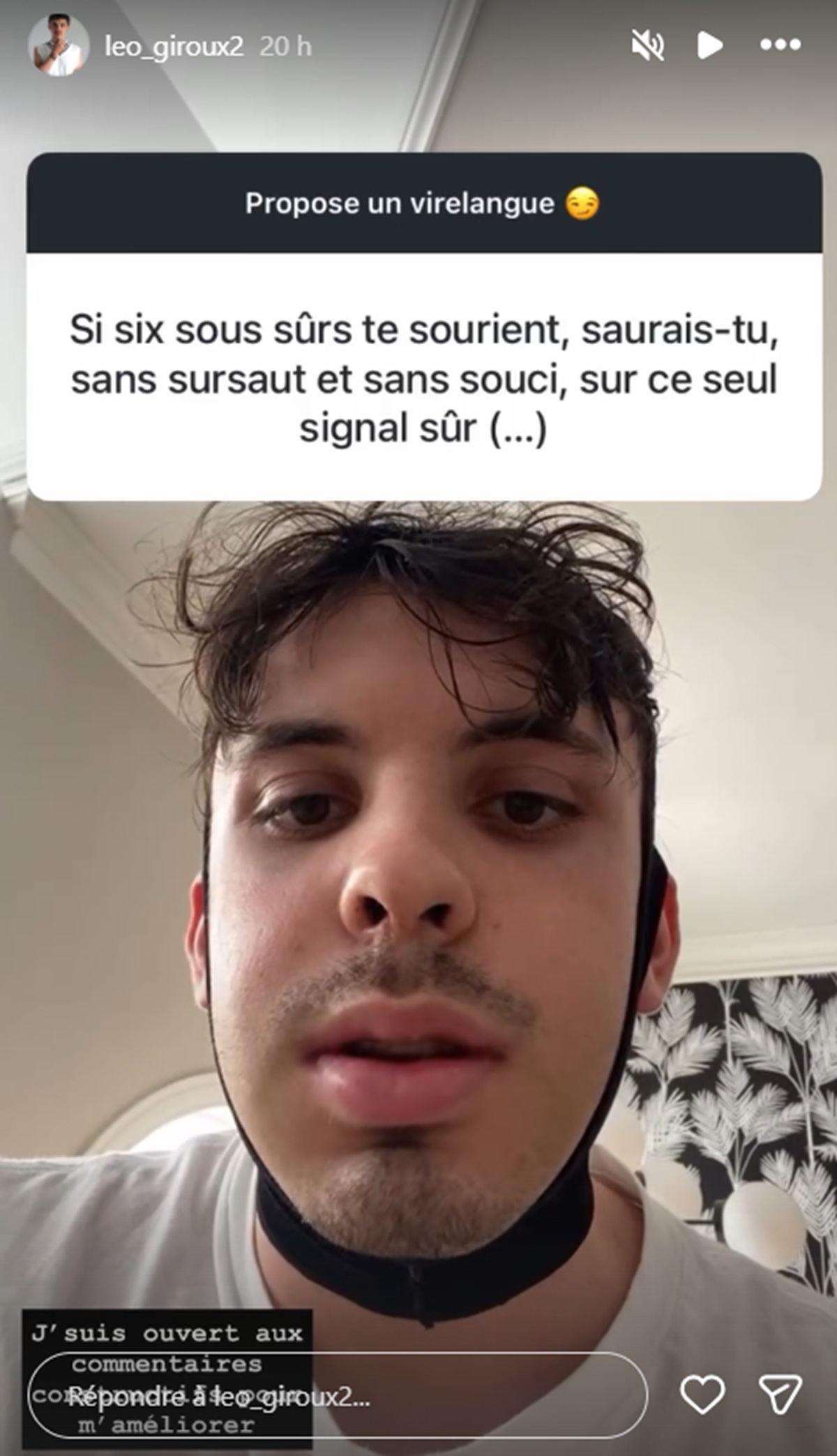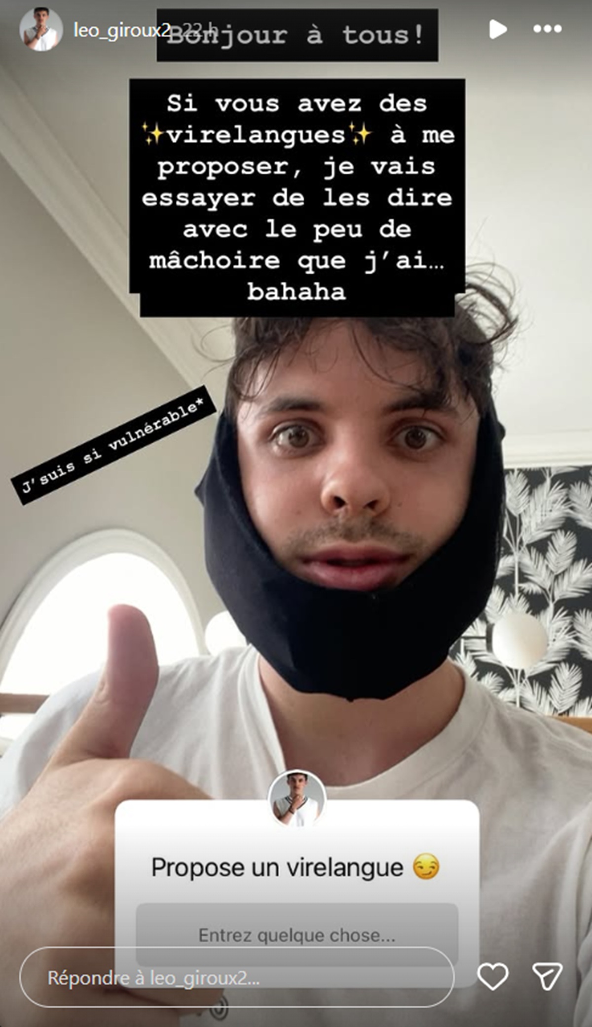 « Bonjour à tous! Si vous avez des virelangues à me proposer, je vais essayer de les dire avec le peu de mâchoire que j’ai… »