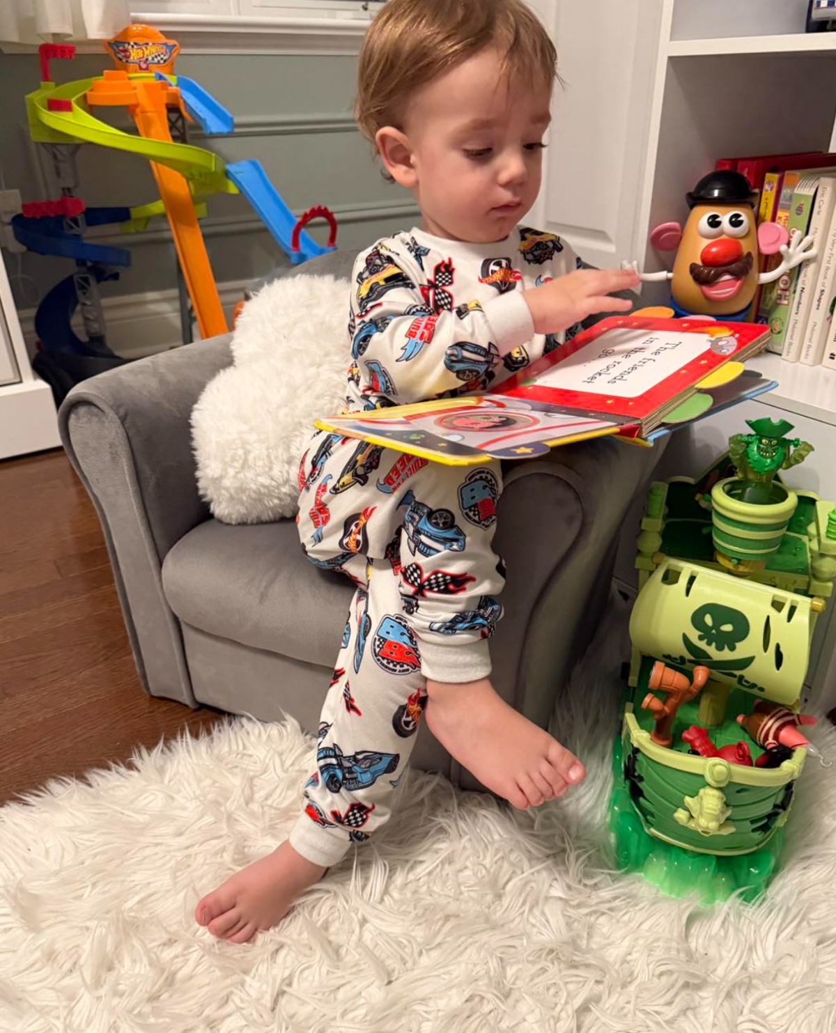 Dans la photo en question, on peut voir le petit garçon assis la jambe croisée sur un fauteuil à sa taille. Il porte un petit pyjama décoré de véhicules motorisés. De plus, il a l’air de se plaire à regarder les pages de son livre.