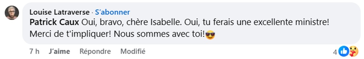 « Oui, bravo, chère Isabelle. Oui, tu ferais une excellente ministre! Merci de t’impliquer! Nous sommes avec toi!😎 »