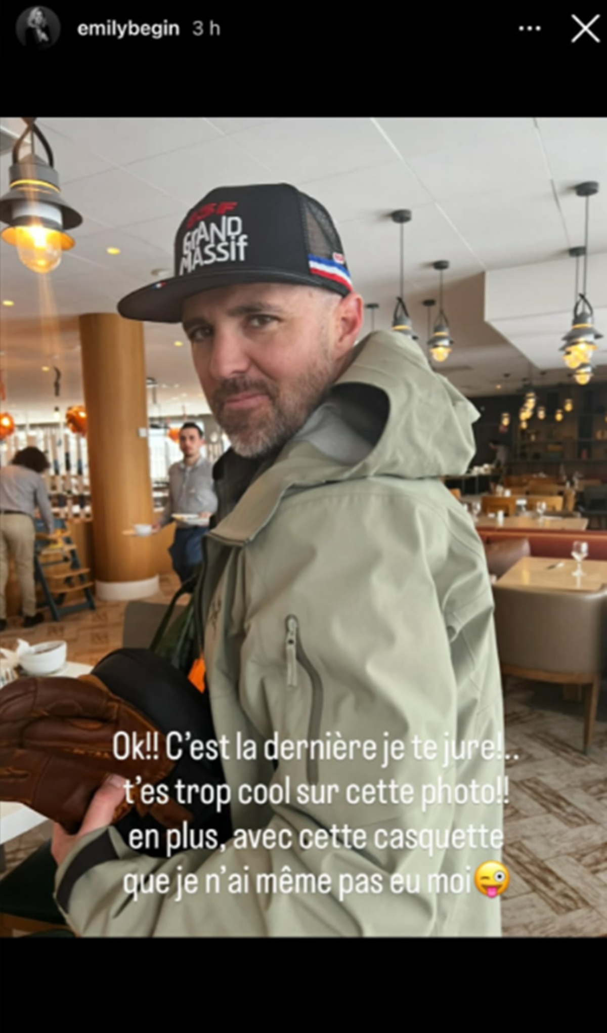 « Ok!! C’est la dernière je te jure! T’es trop cool sur cette photo!! En plus, avec cette casquette que je n’ai même pas eu moi. »