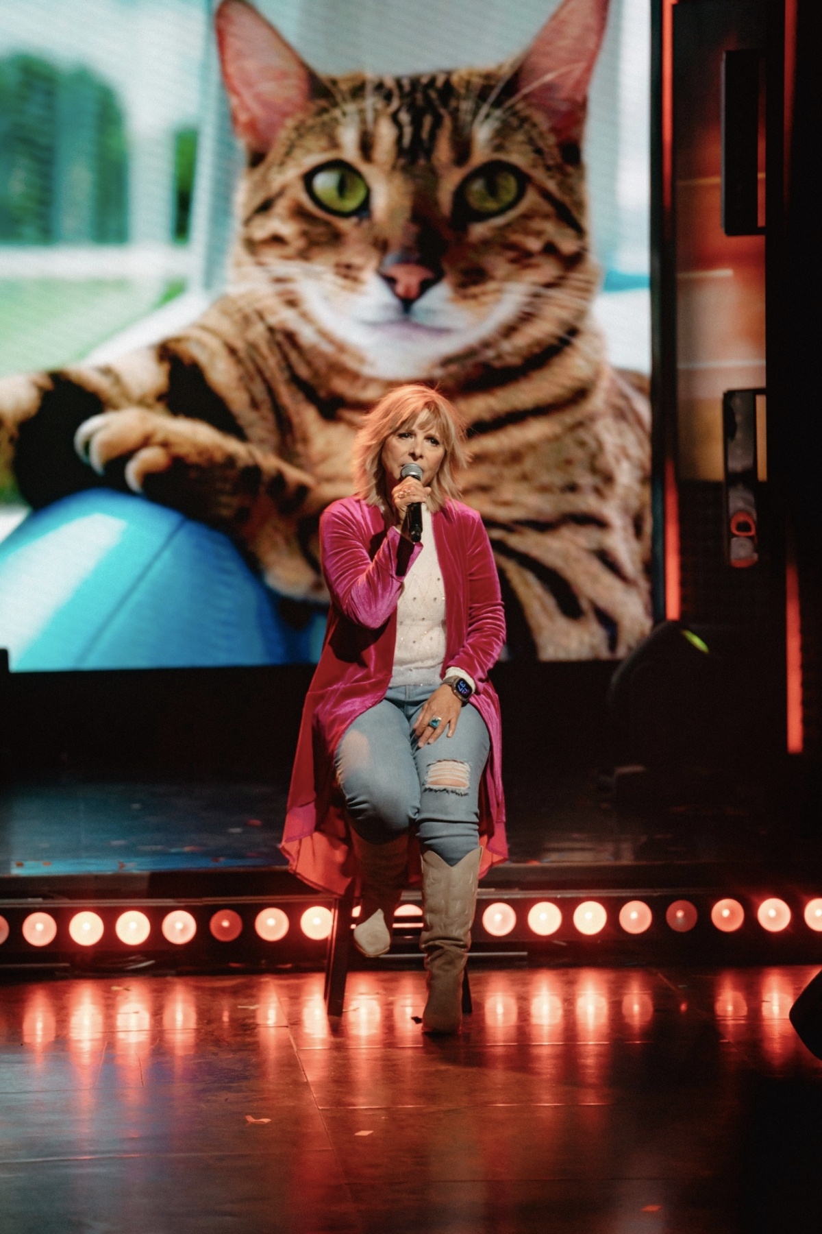 Pour son numéro, une photo de leur chat est apparue derrière elle.