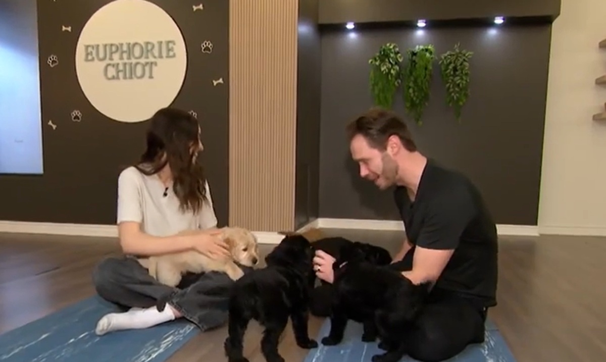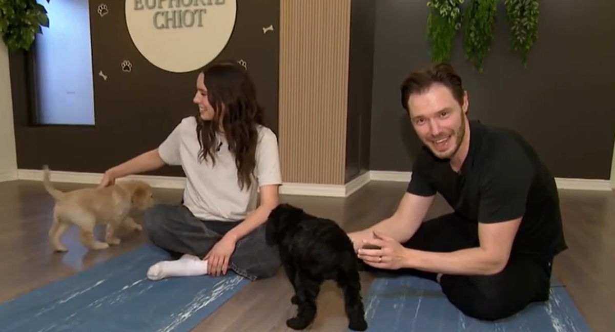 « Vous nous avez peut-être aperçus à la télévision ce matin à Salut Bonjour 👀✨ en compagnie de Martin Vachon, qui a testé l’expérience de puppy yoga chez Euphorie Chiot 🐶🧘♀️🩵