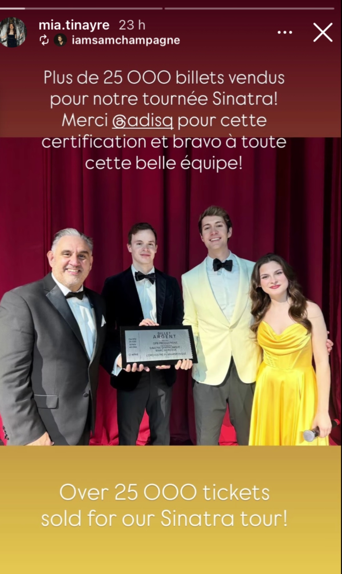 « Plus de 25 000 billets vendus pour notre tournée Sinatra! Merci @adisq pour cette certification et bravo à toute cette belle équipe! »