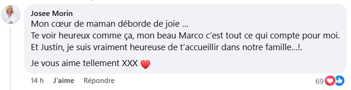 « Wow! Le match parfait ! Félicitation à vous deux !!! Marc-Antoine Delage Je te suis depuis un moment, tu es tellement drôle et un vrai rayon de soleil , de voir que vous êtes un couple toi et Justin wow ! Justin est tellement une bonne personne avec de bonne valeur! Je vous souhaite le meilleur pour les années à venir et que vous ne connaissiez jamais la fin. »