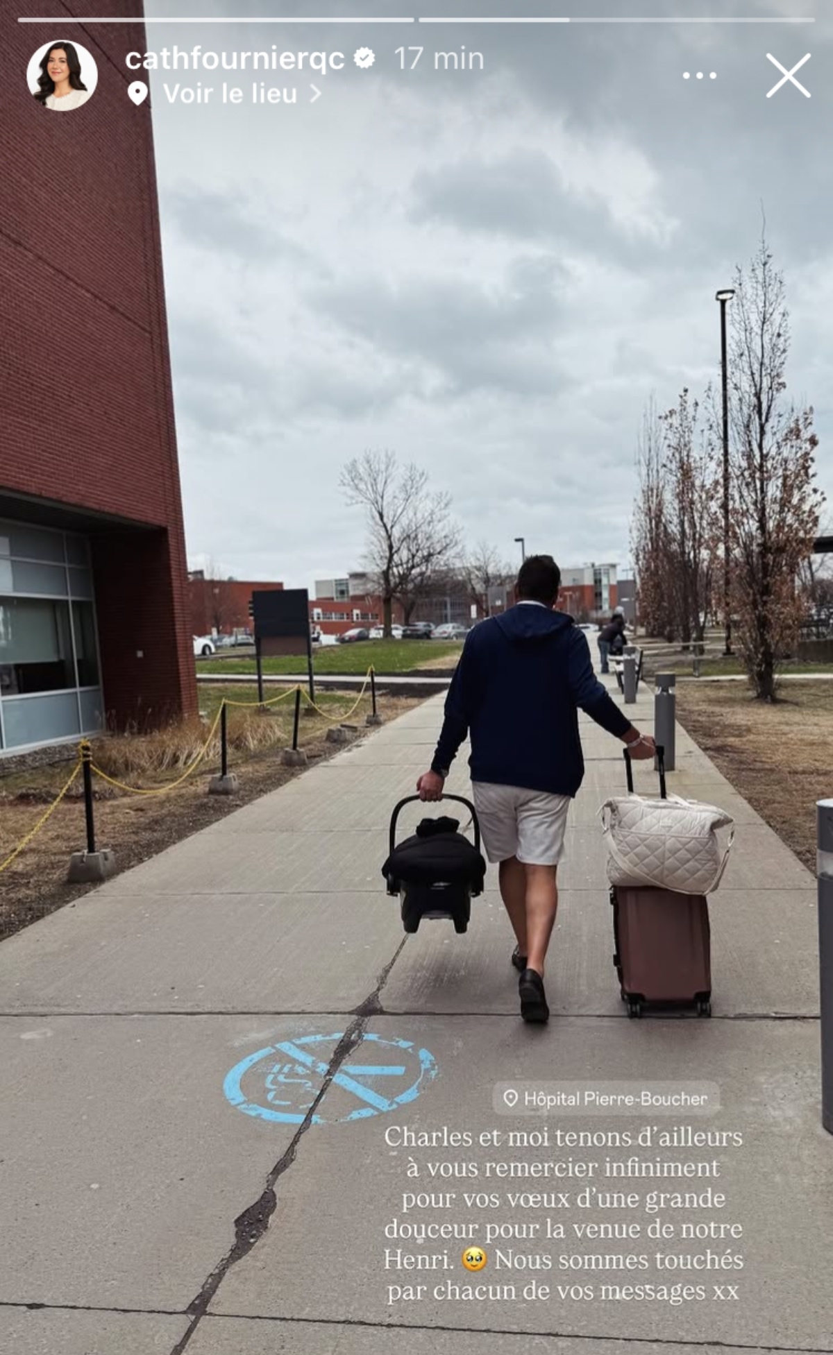 D’ailleurs, elle a profité de ce message pour publier une photo de son conjoint qui a les bras bien remplis. L’une tient des valises alors que l’autre tient le siège portable du petit Henri. Cette photo semble confirmer que le couple a quitté l’hôpital pour rentrer à la maison.