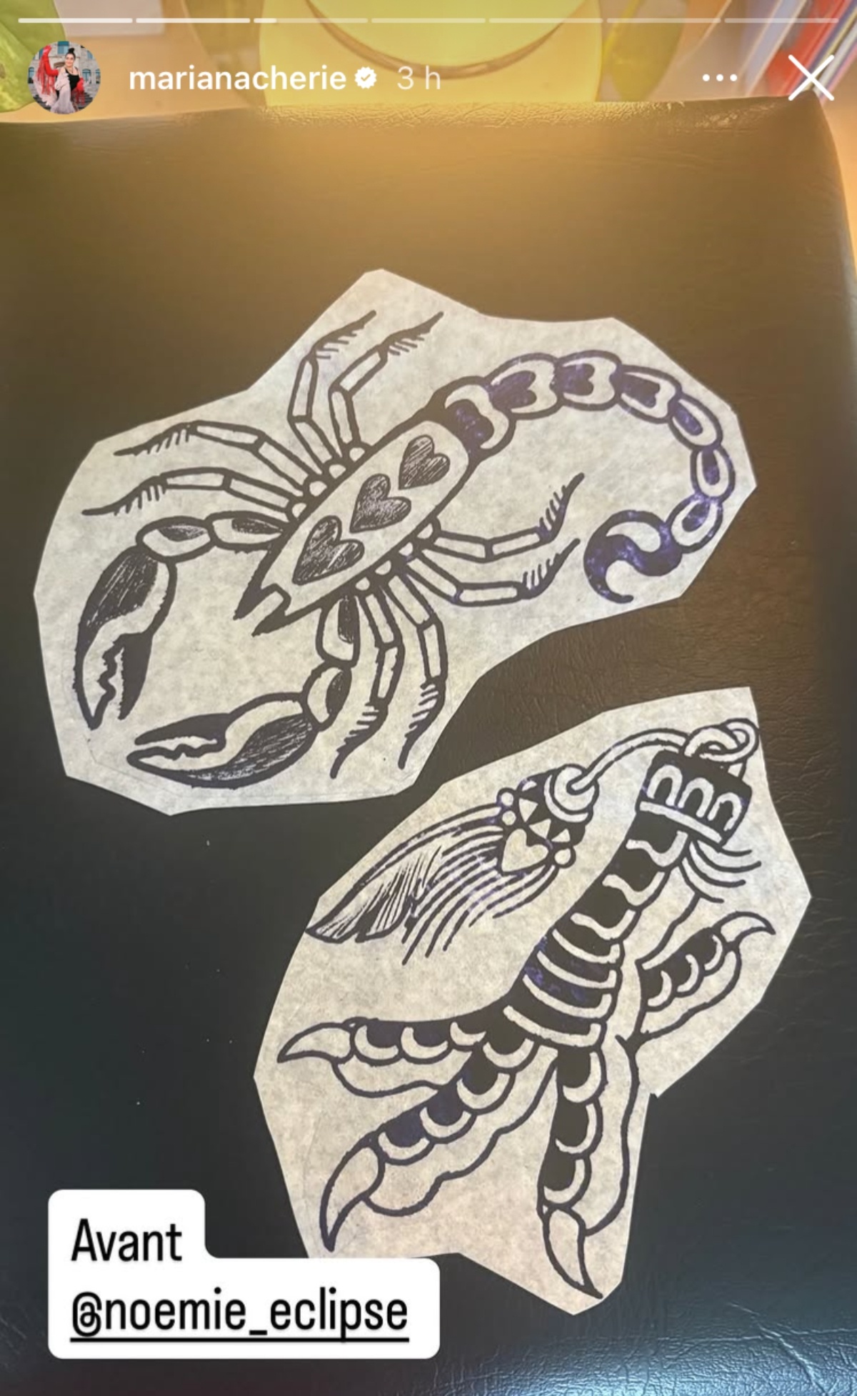 Cette fois, Mariana Mazza a arrêté son choix sur un scorpion et une patte d’oiseau. Pour ce faire, elle a sollicité les services de la tatoueuse Noémie Eclipse.